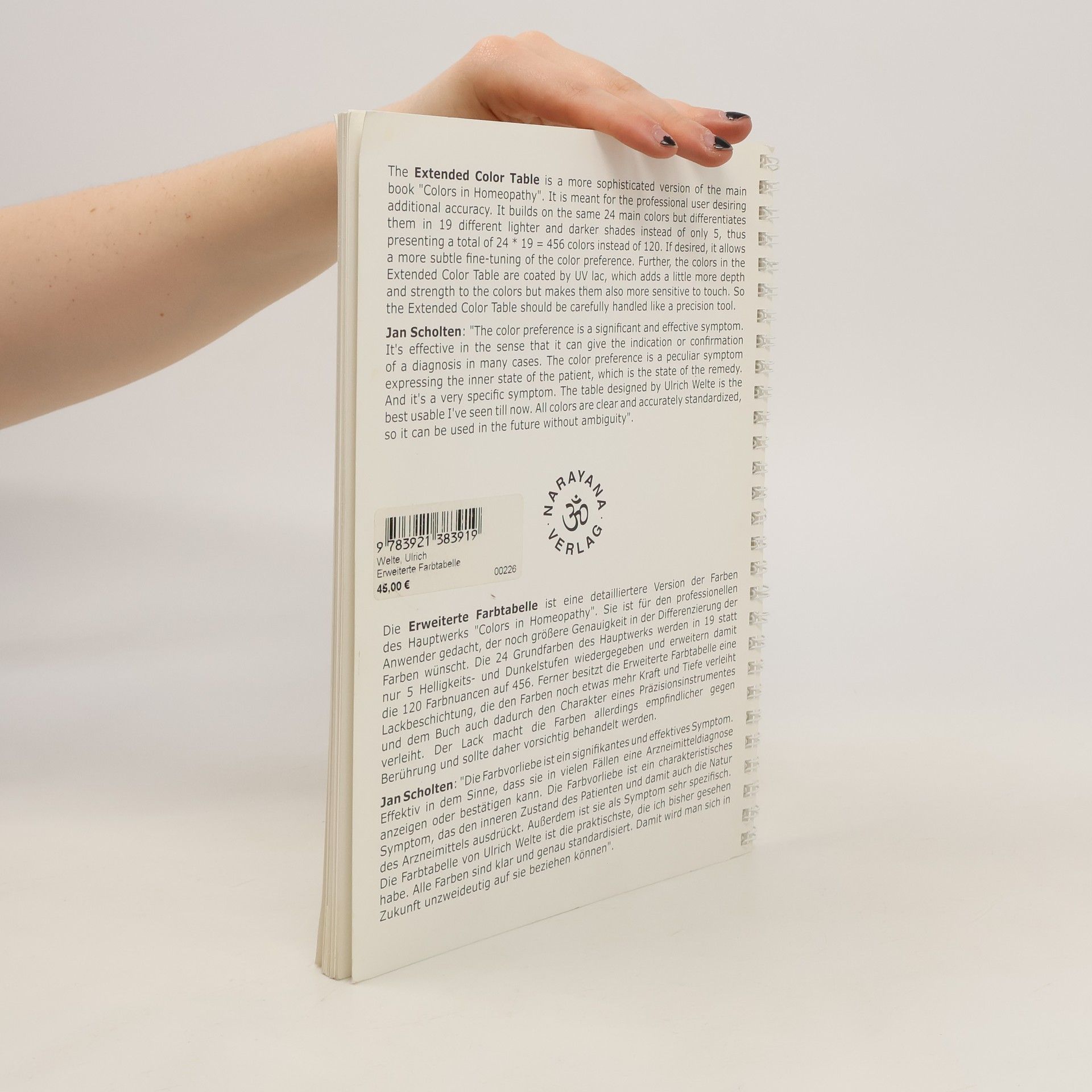 Color charts and Textbook with RepertoryColors in Homeopathy set. Color charts and Textbook with Repertory.The color tables and the repertory (Colors in Homeopathy) together comprise a complete working tool: The color tables with 120 colors is the tool used to determine color preference. They are printed from 24 pure colors using an elaborate processing technique. The color table can be fully opened up and presented to the patient separately from the accompanying text, without needing to turn the pages (as previously required). On the back, there are overview tables to simplify the choice of color. This includes a small overview of all colors on a single page as well as the black-white scale and the new colors silver and gold.They facilitate the differentiation of well-known remedies and also indicate rarer remedies that we might otherwise easily overlook. This work is the worldwide color standard in homeopathy and is used by a number of schools.