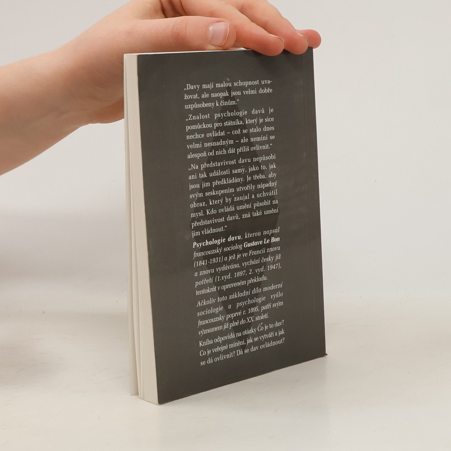 Psychologie davu je známou prací francouzského sociologa Gustava Le Bona z konce 19. století, která analyzuje chování jednotlivců v davu. Le Bon tvrdí, že lidé v davu ztrácejí své individuální svědomí a konformně se podřizují názoru většiny, což je činí snadno ovlivnitelnými vůdci. Podle něj se jedinci, kteří se stanou součástí davu, ocitají na nižším stupni civilizačního vývoje. Kniha, poprvé vydaná v roce 1895 a přeložená do češtiny v roce 1897, byla v minulosti populární a její myšlenky jsou stále relevantní v moderní sociálně-psychologické teorii. Le Bon charakterizuje svou dobu jako „období davů“, kde historické změny vyplývají z proměn myšlení národů. Důvody těchto změn vidí v rozvratu tradičních hodnot a v nových technologiích. V jeho době se veřejné mínění stává klíčovým faktorem historického vývoje, přičemž tradiční autority ztrácejí na významu. V první části knihy autor popisuje vlastnosti davu, kde se vytváří kolektivní duše a ztrácí se individualita. Zmiňuje, že prostorová blízkost není nutná pro vznik davu, což ilustruje na příkladu čtenářů téhož periodika. V druhé části se zabývá faktory ovlivňujícími názory davů, mezi které řadí rasu, tradici, dobu, instituce a výchovu. Rasa je pro něj klíčovým faktorem, přičemž chápe dědičné psychologické vlastnosti, které ovlivňují chování jednotlivců v davu.
