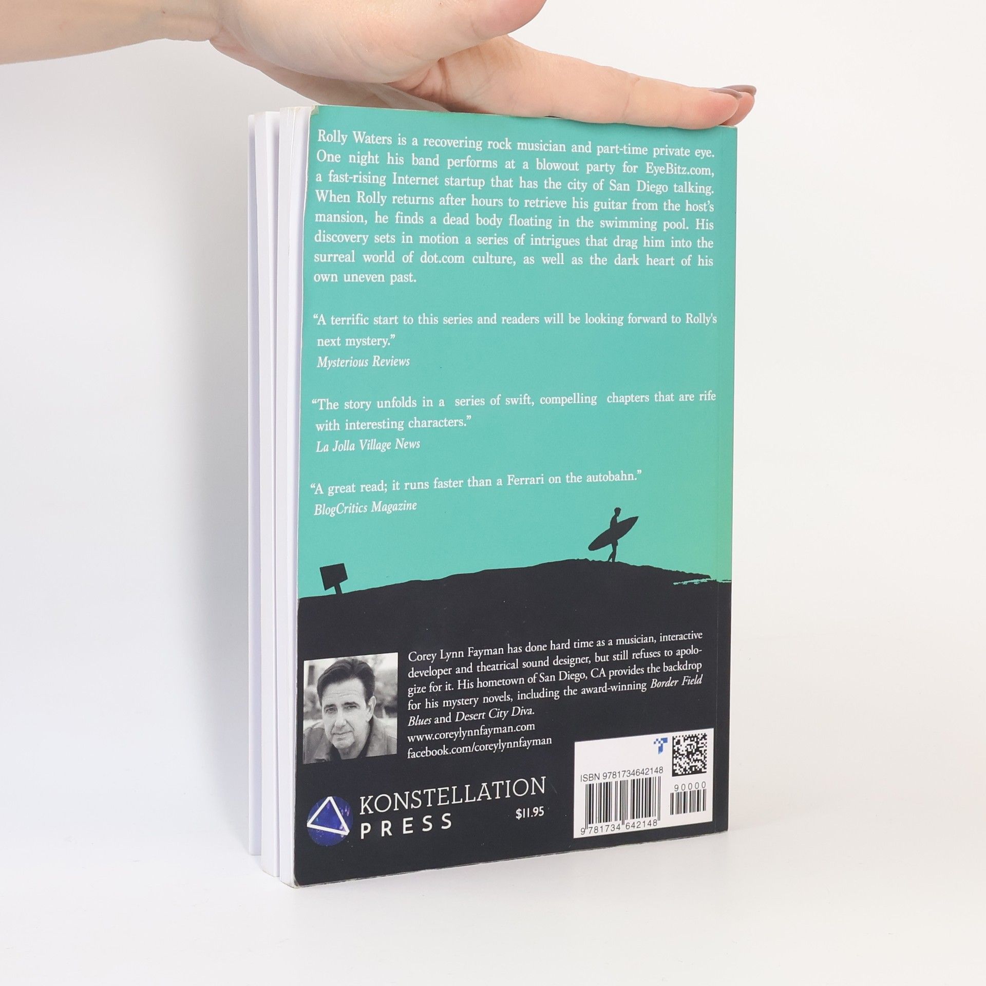 The first novel in the Rolly Waters mystery series Rolly Waters is a recovering rock musician and part-time private eye. One night his band performs at a blowout party for EyeBitz.com, a fast-rising Internet startup that has the city of San Diego talking. When Rolly returns after hours to retrieve his guitar from the host's mansion, he finds a dead body floating in the swimming pool. His discovery sets in motion a series of intrigues that drag him into the surreal world of dot.com culture, as well as the dark heart of his own uneven past.