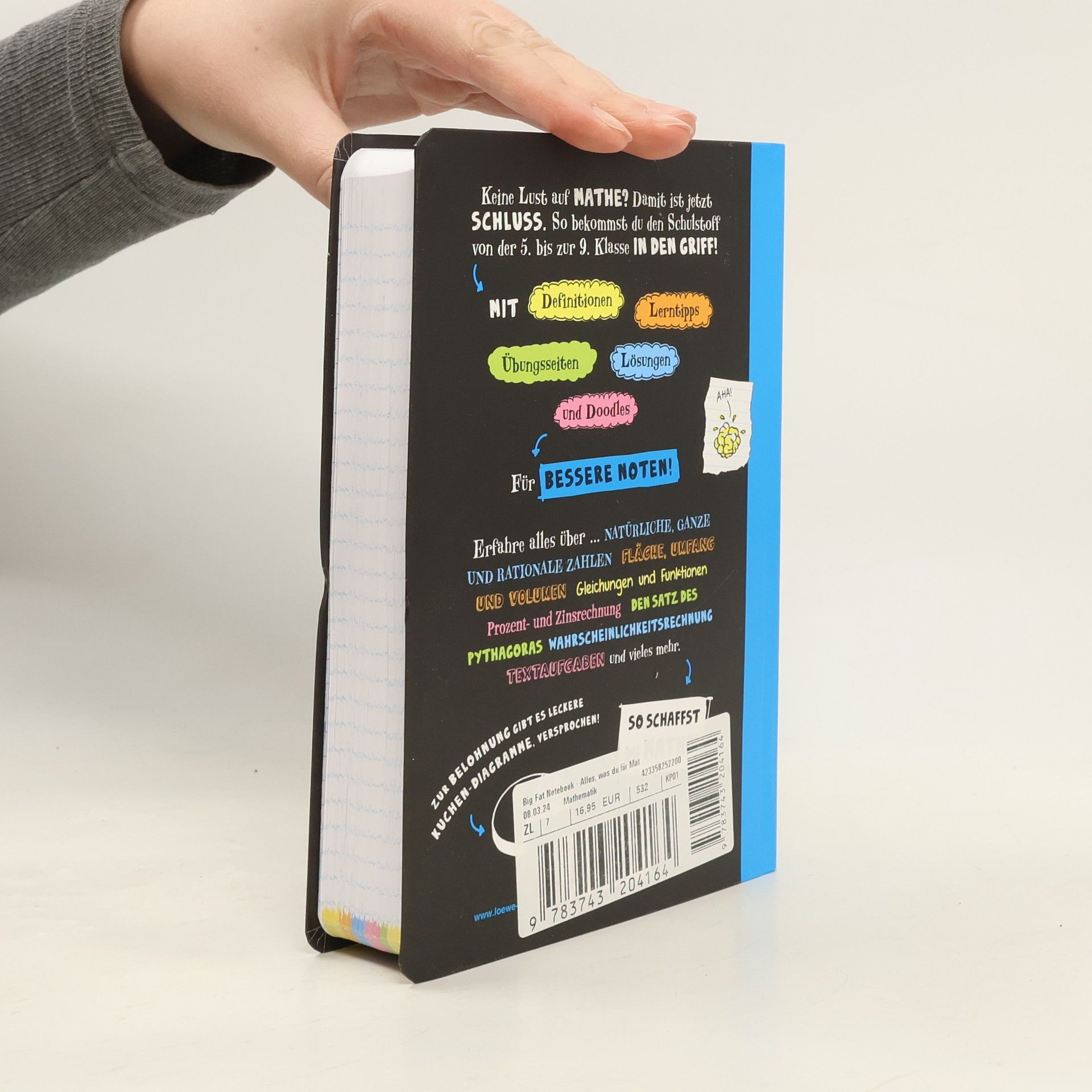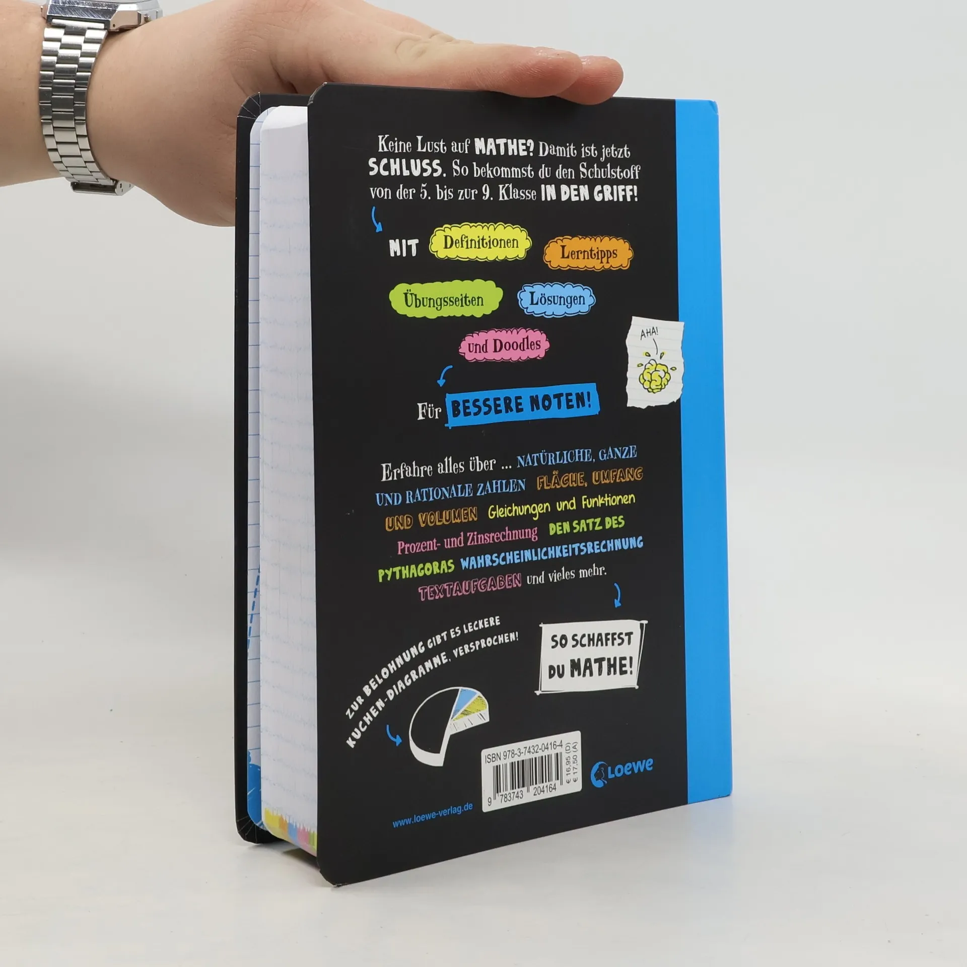 Das Buch ist bei deiner Buchhandlung vor Ort und bei vielen Online-Buchshops erhältlich! Du wolltest schon immer als Mathe-Genie glänzen? Erfahre alles über … … natürliche, ganze und rationale Zahlen, … Fläche, Umfang und Volumen, … Gleichungen und Funktionen, … Prozent- und Zinsrechnung, … den Satz des Pythagoras und vieles mehr. Mit Definitionen, Lerntipps, Übungsseiten und Doodles. Zur Belohnung gibt es leckere Kuchen-Diagramme, versprochen! Ein umfassendes Mathematik-Nachschlagewerk und Übungsbuch für Schüler von der 5. bis zur 9. Klasse. Optimal geeignet zur Vertiefung und Auffrischung schulischer Inhalte und zur Vorbereitung auf schulische Tests. Die ungewöhnliche Gestaltung mit Scribbles und Cartoons sowie witzige Kommentare sorgen für Auflockerung. Nach jedem Kapitel folgt ein Wissensquiz, Multiple-Choice-Test oder ein Lückentext zur Lernkontrolle.