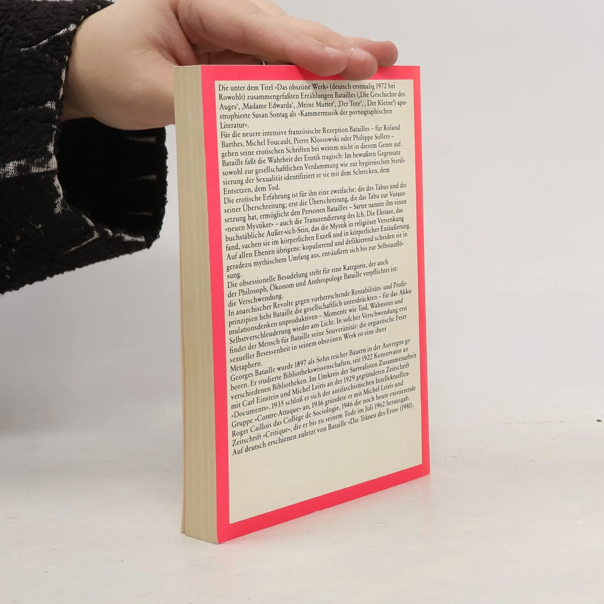 Georges Bataille wurde 1897 als Sohn reicher Bauern in der Auvergne geboren. Er studierte Bibliothekswissenschaften, seit 1922 Konservator an verschiedenen Bibliotheken. Im Umkreis der Surrealisten Zusammenarbeit mit Carl Einstein und Michel Leiris an der 1929 gegründeten Zeitschrift „Documents“. 1935 schloß er sich der antifaschistischen Intellektuellen-Gruppe „Contre Attaque“ an, 1936 gründete er mit Michel Leiris und Roger Caillois das College de Sociologie, 1946 die noch heute existierende Zeitschrift „Critique“, die er bis zu seinem Tode im Juli 1962 herausgab. Auf deutsch erschienen zuletzt von Bataille „Die Tränen des Eros“ (1981).