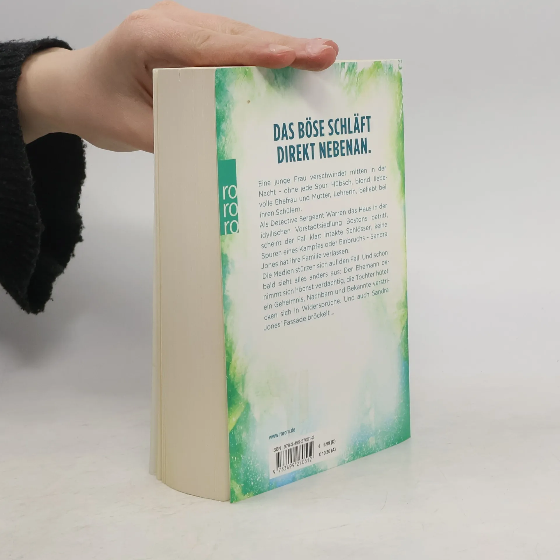 Das Böse schläft direkt nebenan … Eine junge Frau verschwindet mitten in der Nacht – ohne jede Spur. Hübsch, blond, liebevolle Ehefrau und Mutter, Lehrerin, beliebt bei ihren Schülern. Als Detective Sergeant Warren das Haus in der idyllischen Vorstadtsiedlung Bostons betritt, scheint der Fall klar: Intakte Schlösser, keine Spuren eines Kampfes oder Einbruchs – Sandra Jones hat ihre Familie verlassen. Die Medien stürzen sich auf den Fall. Und schon bald sieht alles anders aus: Der Ehemann benimmt sich höchst verdächtig, die Tochter hütet ein Geheimnis, Nachbarn und Bekannte verstricken sich in Widersprüche. Und auch Sandra Jones’ Fassade bröckelt ...