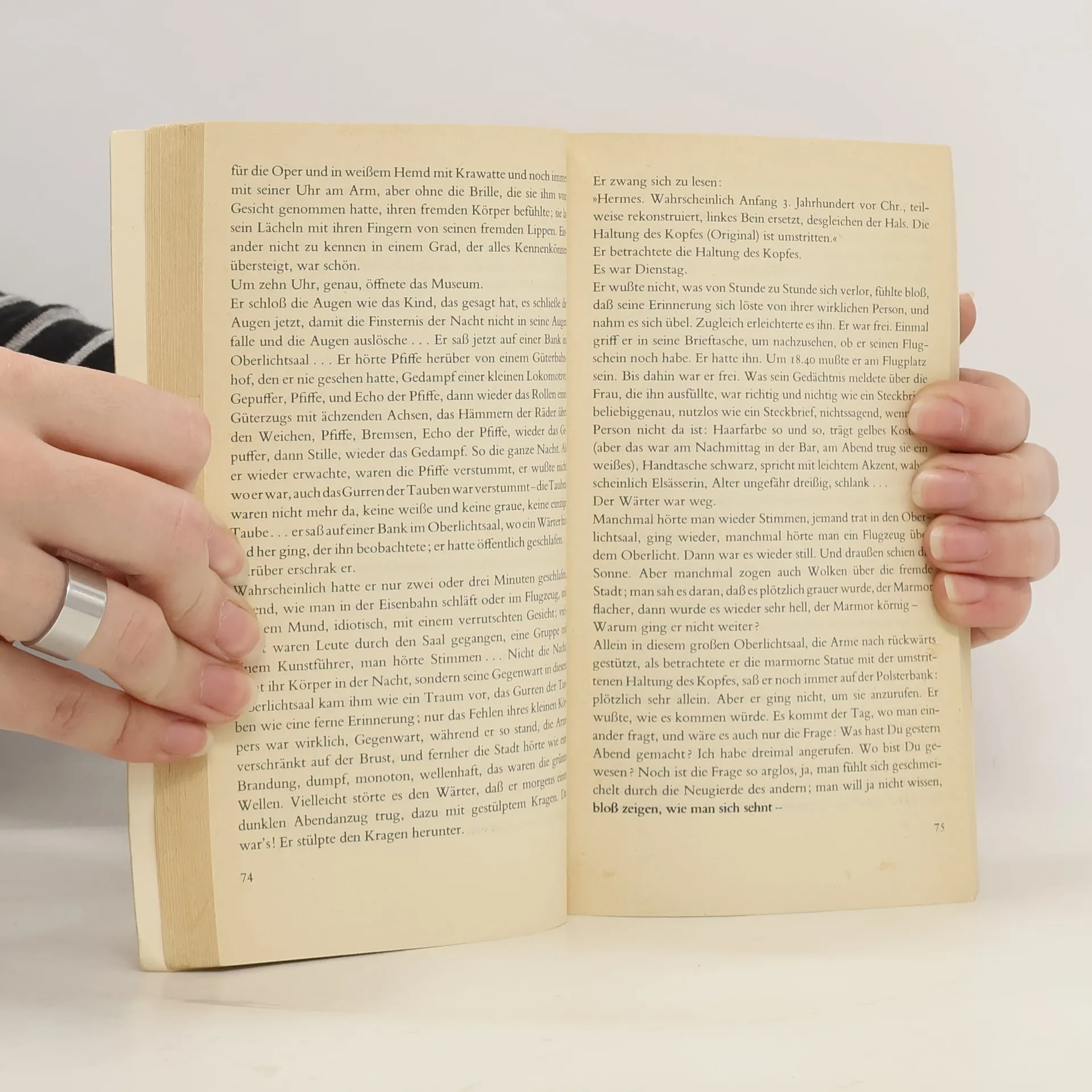 Der Erzähler erfindet (»Ich stelle mir vor:«) mögliche Lebensgeschichten dreier Personen: Da ist Gantenbein, der einen Blinden spielt, um so genauer seine Umwelt beobachten zu können. Oder da ist Enderlin, der immer »ein fremder Herr« bleibt. Auch Svoboda muß die Erfahrung machen, daß Liebe und Ehe endlich sind. Übrig im Spiel der erdichteten Rollen bleibt: Gantenbein.