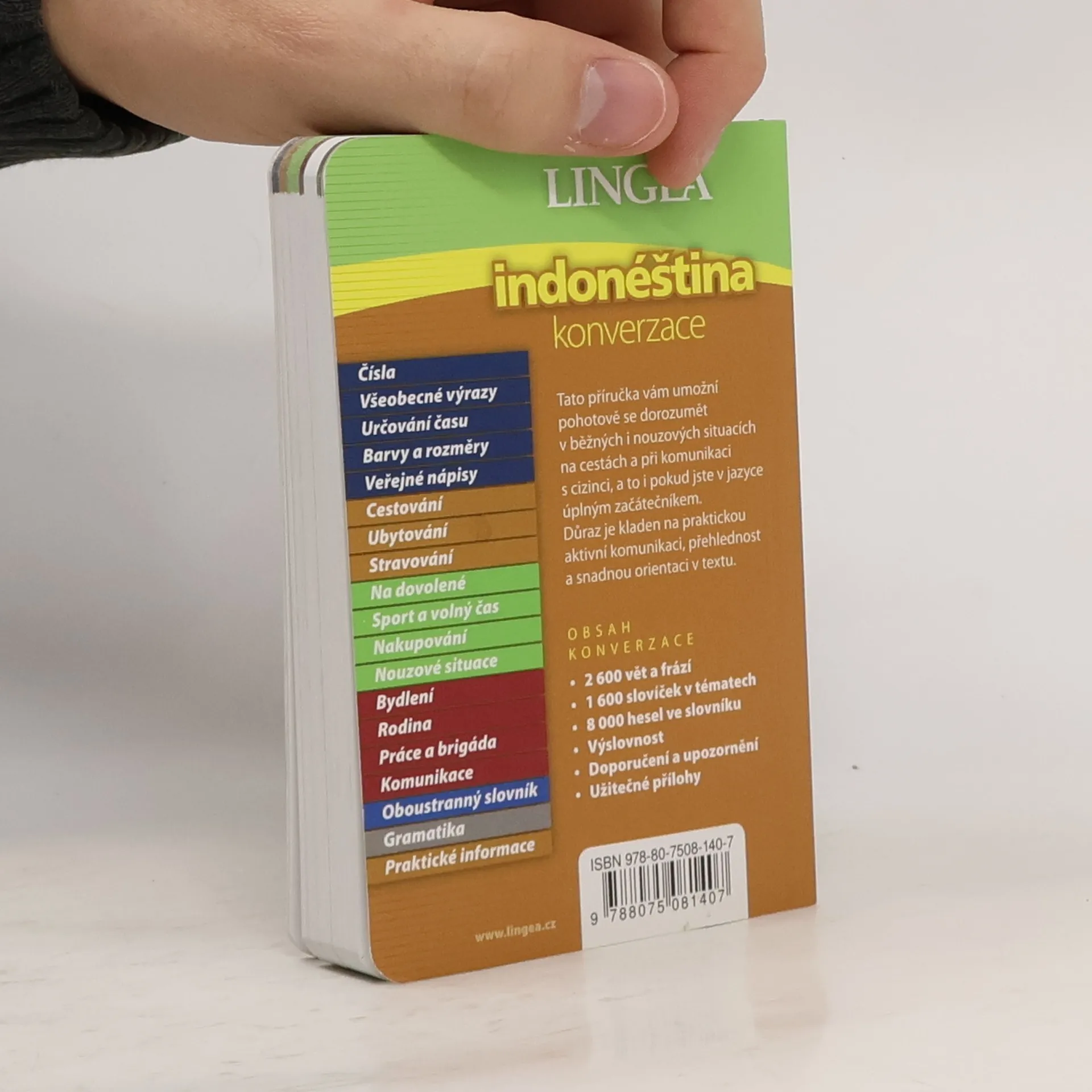 Indonéština patří k vzdálené malajsko-polynéské jazykové skupině. Vyznačuje se velmi jednoduchou gramatikou bez času a pádů, snadnou výslovností a píše se latinkou. Její základy lze při určitém úsilí zvládnout již za pár týdnů, které zbývají před odjezdem za exotikou. Součástí příručky je i oboustranný slovník a základní přehled gramatiky. 2 600 vět a frází, 1 600 slovíček v tématech 6 000 hesel ve slovníku (pouze v knize) Doporučení a upozornění Přepis výslovnosti všech frází 19 stran gramatiky 12 stran praktických informací o zemi