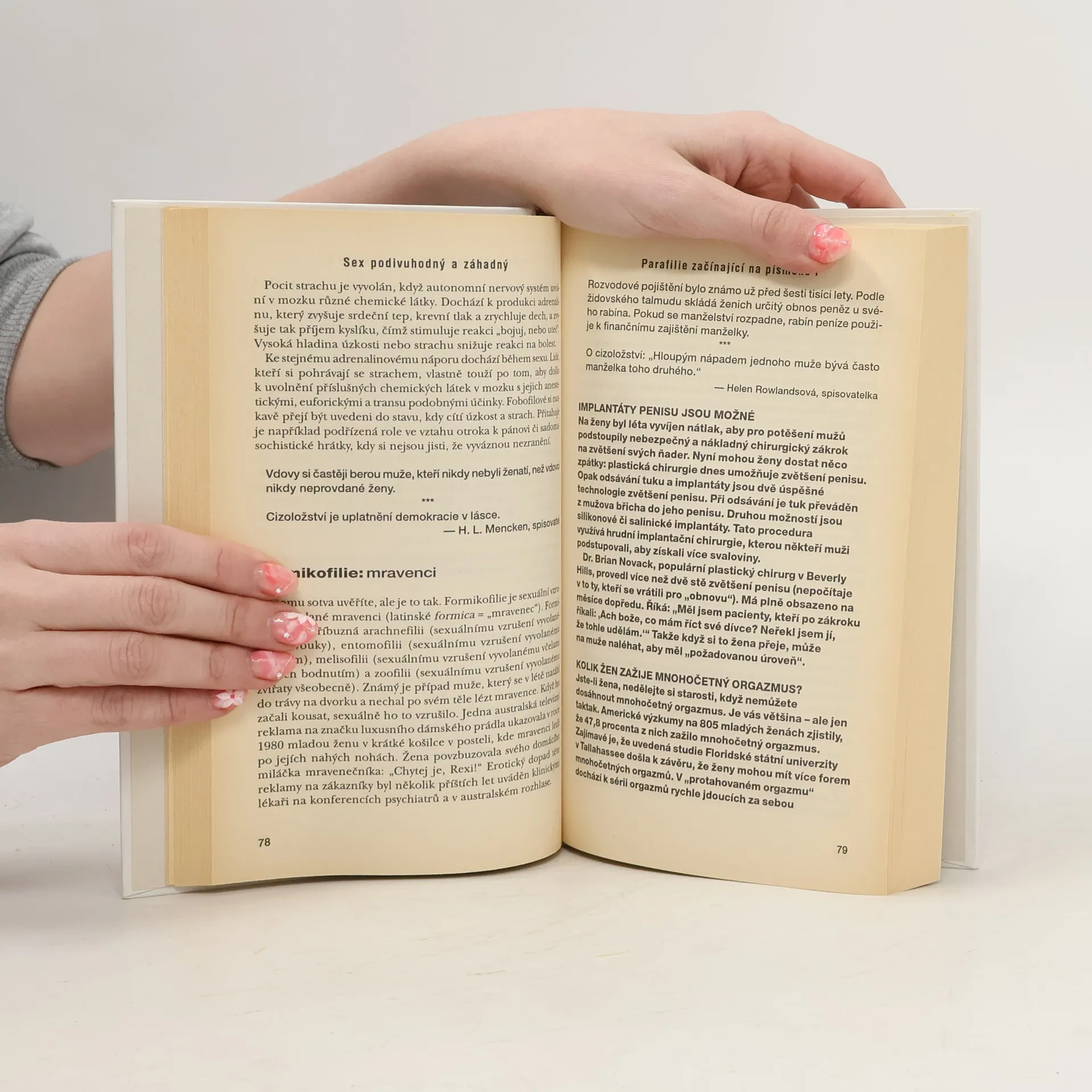 Znáte někoho, kdo se nezvykle vzruší, když slyší projev nebo kázání? Vypadá to, že má homilofilii. Pak tu jsou formikofilové, které vzrušují mravenci, a to nemluvím o hierofilech, kteří mají zvláštní vztah k náboženským předmětům. Většina z nás si myslí, že jsme trochu normálnější než tihle, ale slyšeli jste o normofilii, posedlosti napodobováním...? Dr.Stephen Juan ve své čtvrté knize o podivuhodném a záhadném lidském těle mluví otevřeně o patrně nejzajímavějším tématu, které se týká lidského života. K čemu je vlastně sex? Je pravda, že muži mají silnější sexuální nutkání? Mohou ženy, které propadly nakupování šatů, být parafiličkami? A jak to je s muži, kteří jezdí v rychlých vozech?