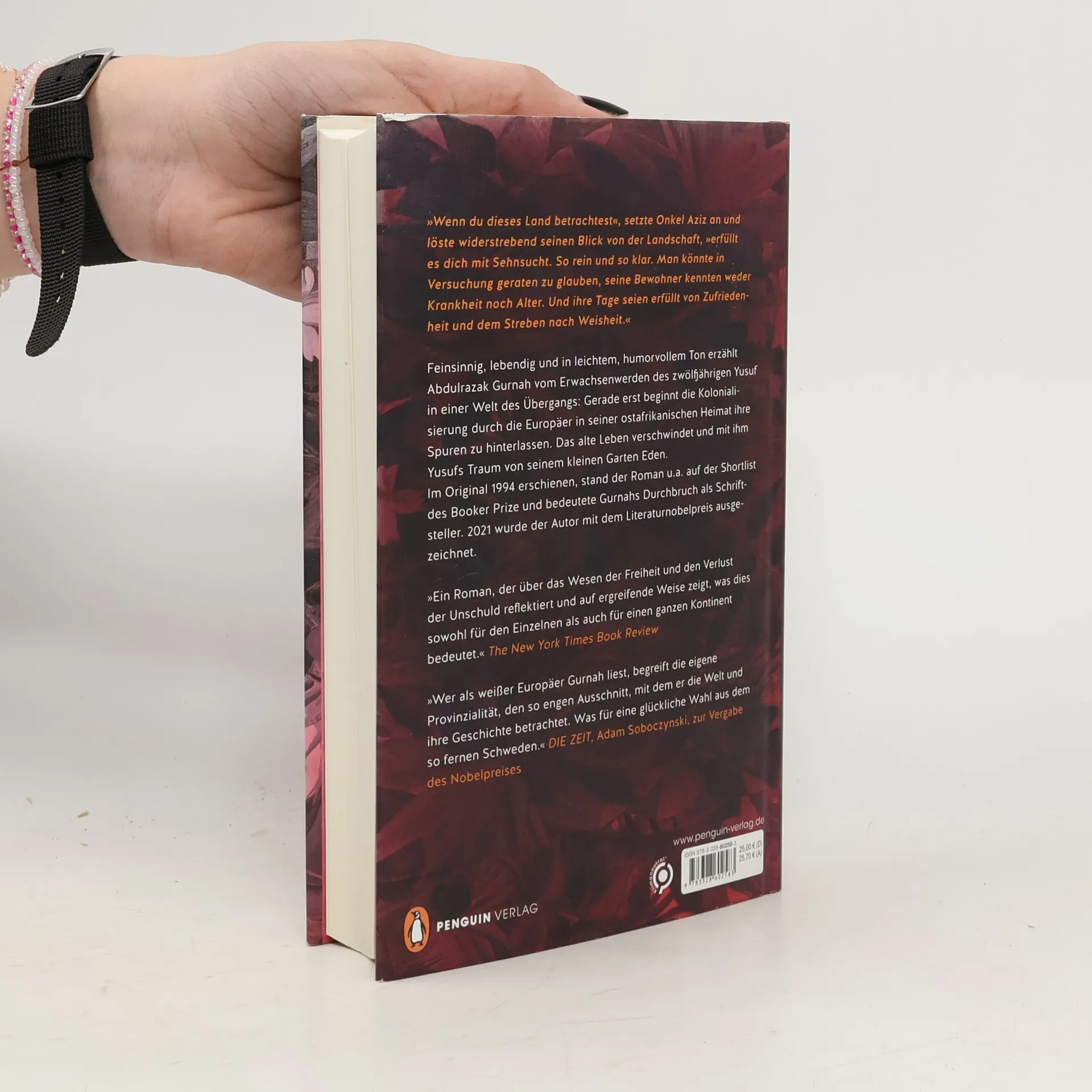 Endlich wieder in deutscher Übersetzung erhältlich: das Buch, mit dem Abdulrazak Gurnah der Durchbruch gelang. Ostafrika, Anfang des 20. Jahrhunderts: Der zwölfjährige Yusuf lebt mit seiner Familie ein einfaches Leben auf dem Land. Als sein Vater sich mit einem kleinen Hotel verschuldet, wird Yusuf zu Onkel Aziz gegeben und findet sich im lebhaften Treiben der Stadt wieder, umgeben von afrikanischen Muslimen, christlichen Missionaren und indischen Geldverleihern. Diese Gemeinschaft ist von subtilen Hierarchien geprägt. Yusuf hilft in Aziz' Laden und pflegt dessen paradiesisch anmutenden Garten. Doch als der Kaufmann ihn auf eine Karawanenreise ins Landesinnere mitnimmt, endet Yusufs Kindheit abrupt. Die gefährliche Unternehmung bringt Krankheit und Tod und offenbart, dass die traditionelle Handelsweise keine Zukunft hat. Diese Erfahrungen lassen Yusuf erwachsen werden. Nach seiner Rückkehr verliebt er sich leidenschaftlich, wird jedoch brutal mit der neuen Realität der deutschen Kolonialherrschaft konfrontiert. Einfühlsam, lebendig und mit einem humorvollen Ton erzählt Gurnah von der Coming-of-Age-Geschichte in Zeiten des kolonialen Umbruchs. Der Roman, 1994 erschienen und auf der Shortlist des Booker Prize, ist nun wieder in der Übersetzung von Inge Leipold auf Deutsch erhältlich.