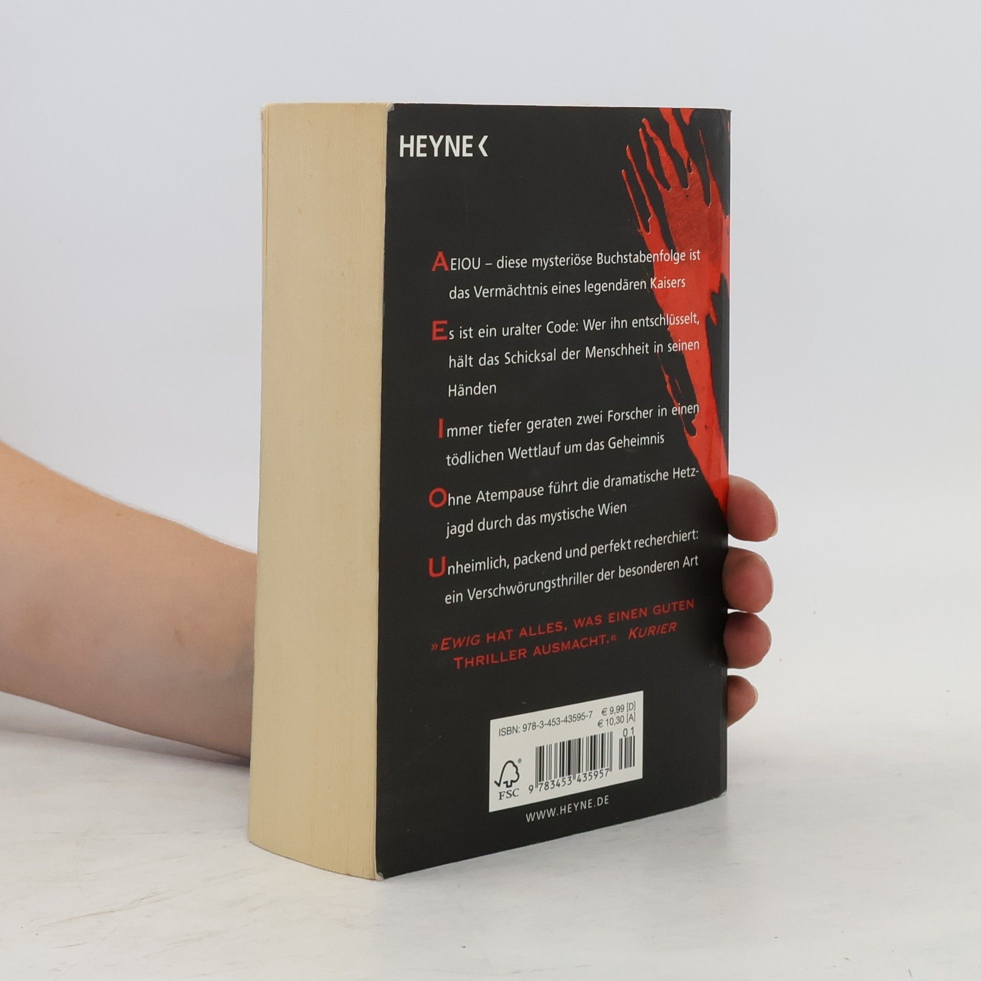 Zwei legendäre Kaiser, ein uraltes Rätsel – das größte Geheimnis der Menschheit AEIOU – diese mysteriöse Buchstabenfolge ist das Vermächtnis eines legendären Kaisers Es ist ein uralter Code: Wer ihn entschlüsselt, hält das Schicksal der Menschheit in seinen Händen. Immer tiefer geraten zwei Forscher in einen tödlichen Wettlauf um das Geheimnis Ohne Atempause führt die dramatische Hetzjagd durch das mystische Wien. Unheimlich, packend und perfekt recherchiert: ein Verschwörungsthriller der besonderen Art.
