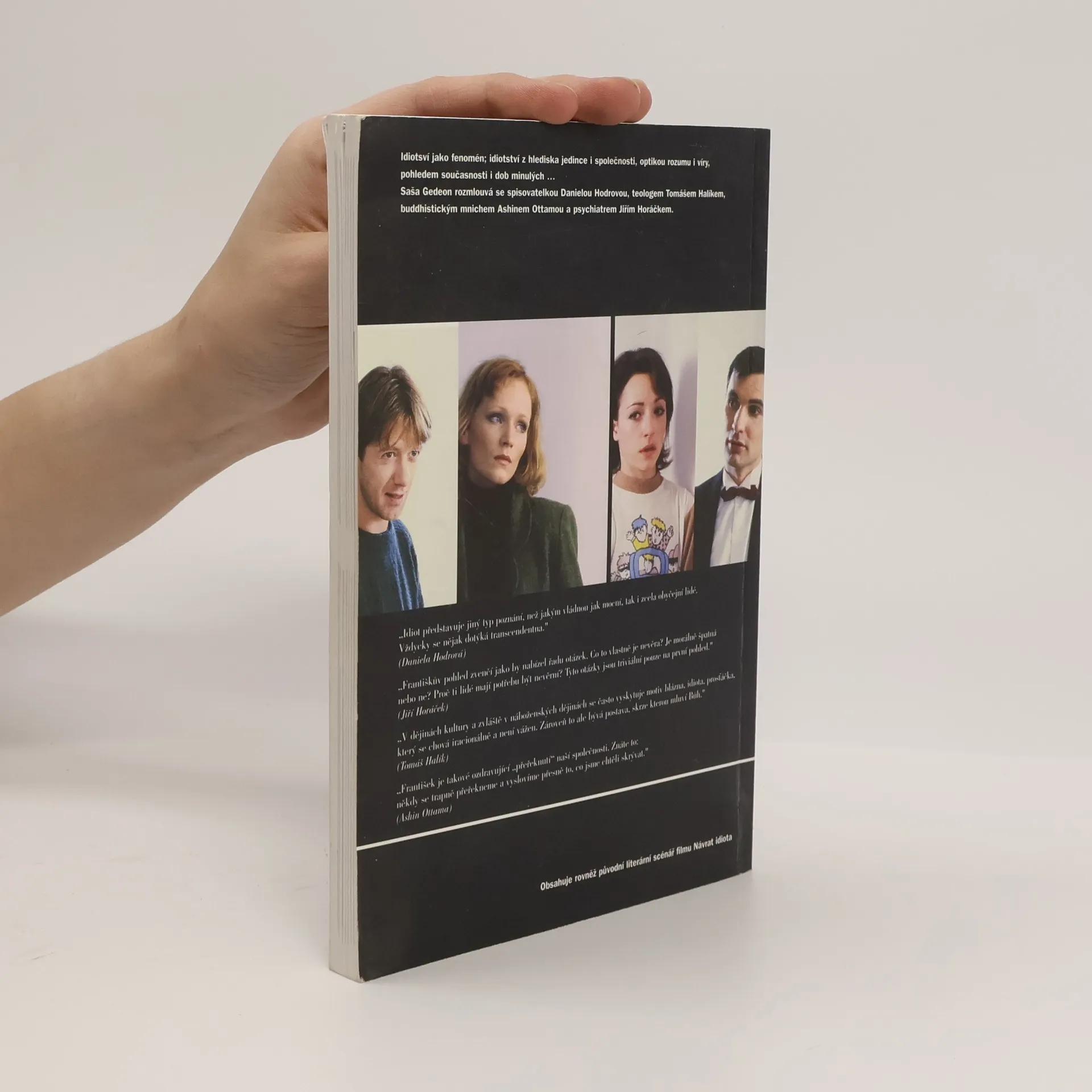 Kniha obsahuje původní literární scénář filmu Návrat idiota, fotografie z filmu a to, „co ve filmu nebylo“. Saša Gedeon rozmlouvá se spisovatelkou Danielou Hodrovou, teologem Tomášem Halíkem, buddhistickým mnichem Ashinem Ottamou a psychiatrem Jiřím Horáčkem.