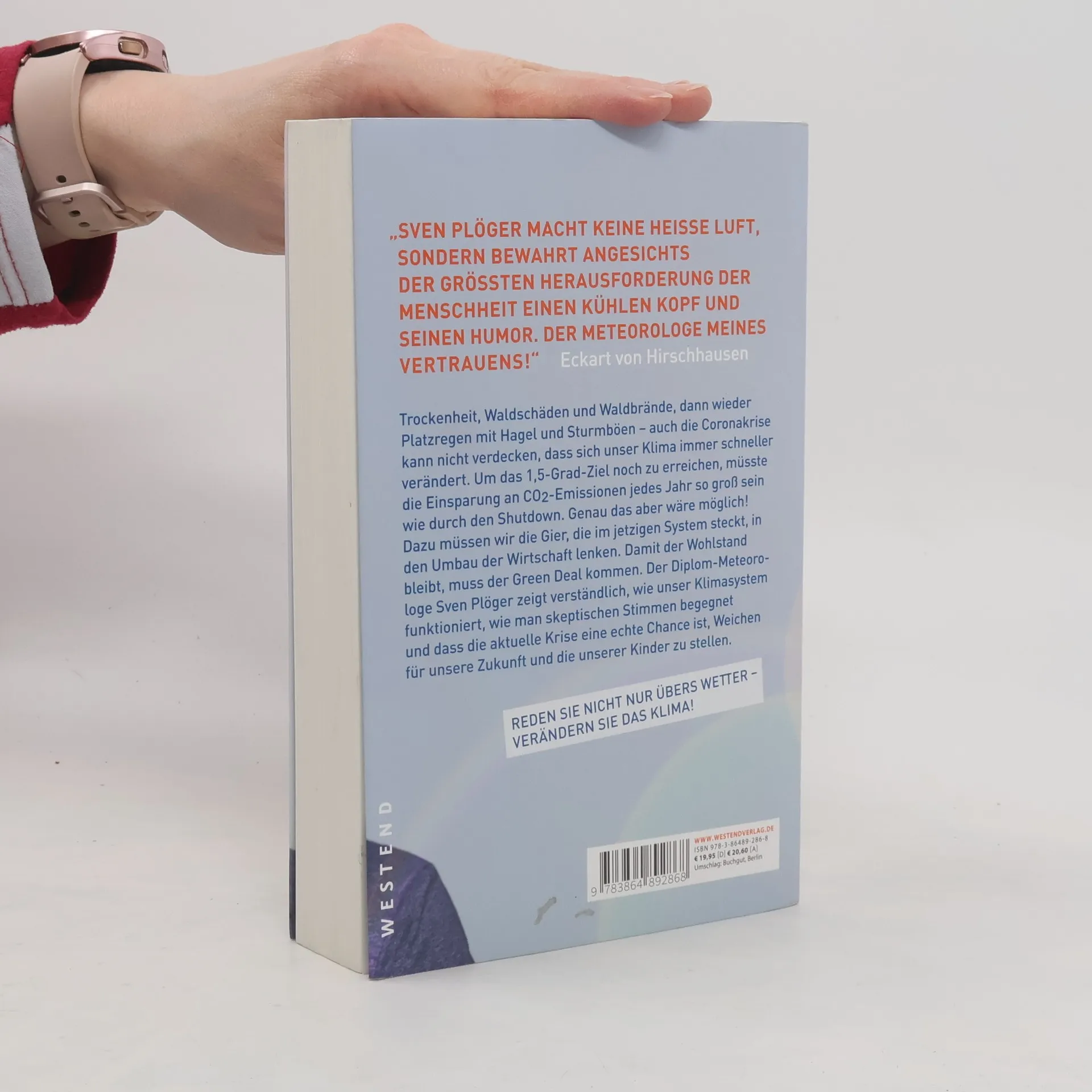 „Sven Plöger macht keine heiße Luft, sondern bewahrt angesichts der größten Herausforderung der Menschheit einen kühlen Kopf und seinen Humor. Der Meteorologe meines Vertrauens!“ Eckart von Hirschhausen Trockenheit, Waldschäden und Waldbrände, dann wieder Platzregen mit Hagel und Sturmböen – auch die Coronakrise kann nicht verdecken, dass sich unser Klima immer schneller verändert. Um das 1,5-Grad-Ziel noch zu erreichen, müsste die Einsparung an CO2-Emissionen jedes Jahr so groß sein wie durch den Shutdown. Genau das aber wäre möglich! Dazu müssen wir die Gier, die im jetzigen System steckt, in den Umbau der Wirtschaft lenken. Damit der Wohlstand bleibt, muss der Green Deal kommen. Der Diplom-Meteorologe Sven Plöger zeigt verständlich, wie unser Klimasystem funktioniert, wie man skeptischen Stimmen begegnet und dass die aktuelle Krise eine echte Chance ist, Weichen für unsere Zukunft und die unserer Kinder zu stellen. Mit Praxisteil: Reden Sie nicht nur übers Wetter – verändern Sie das Klima!