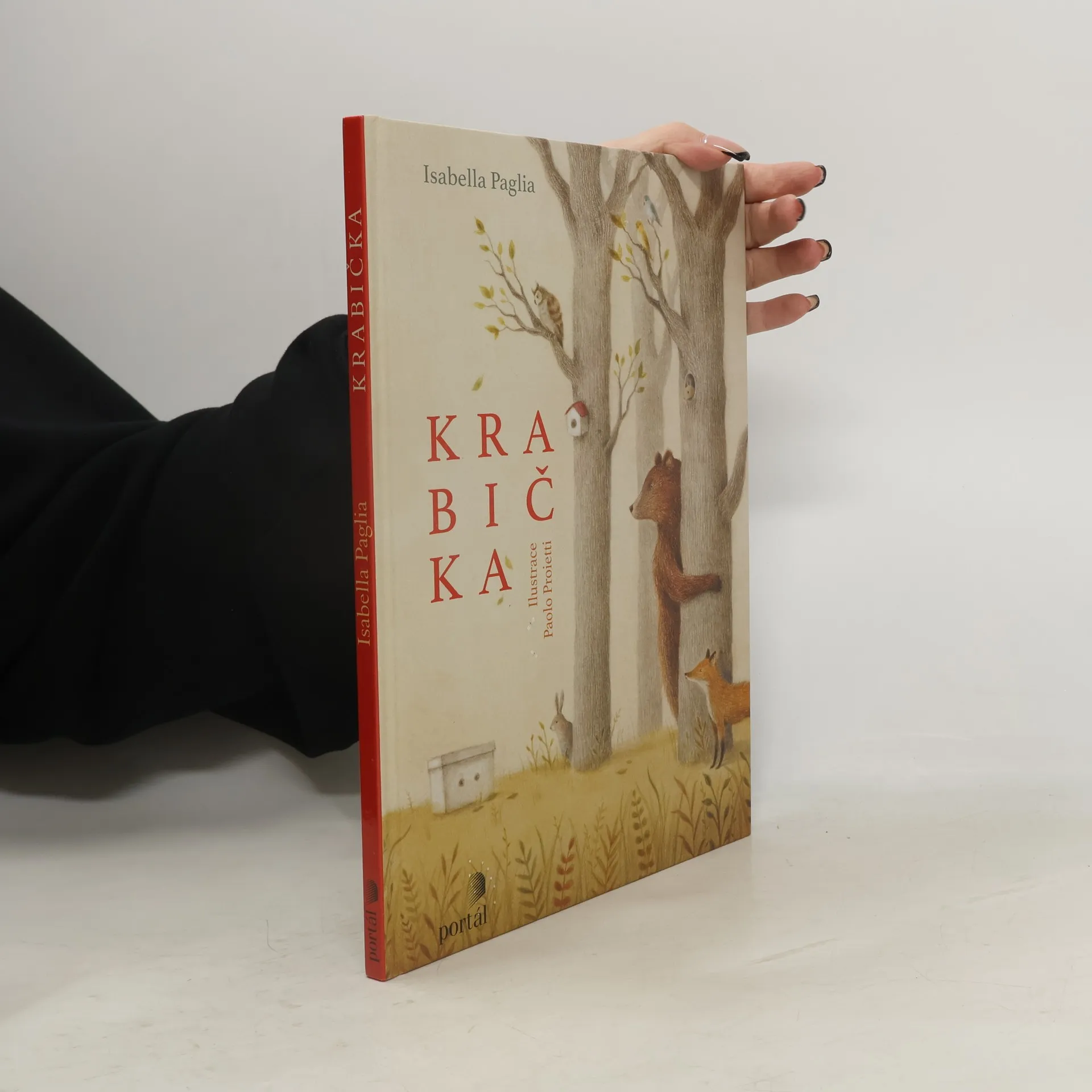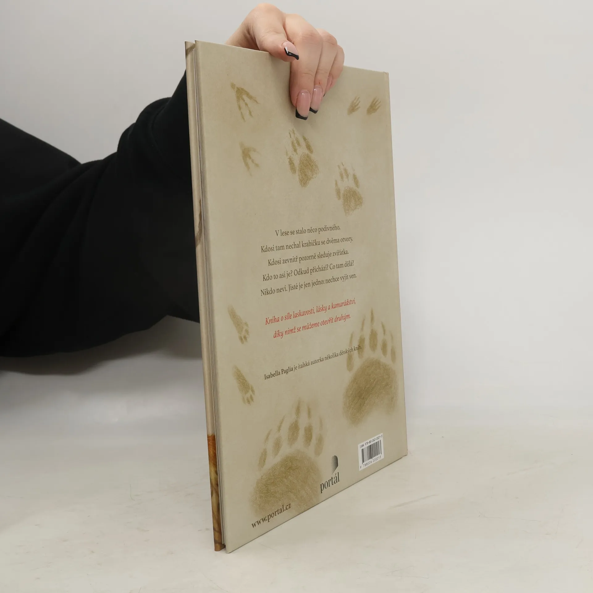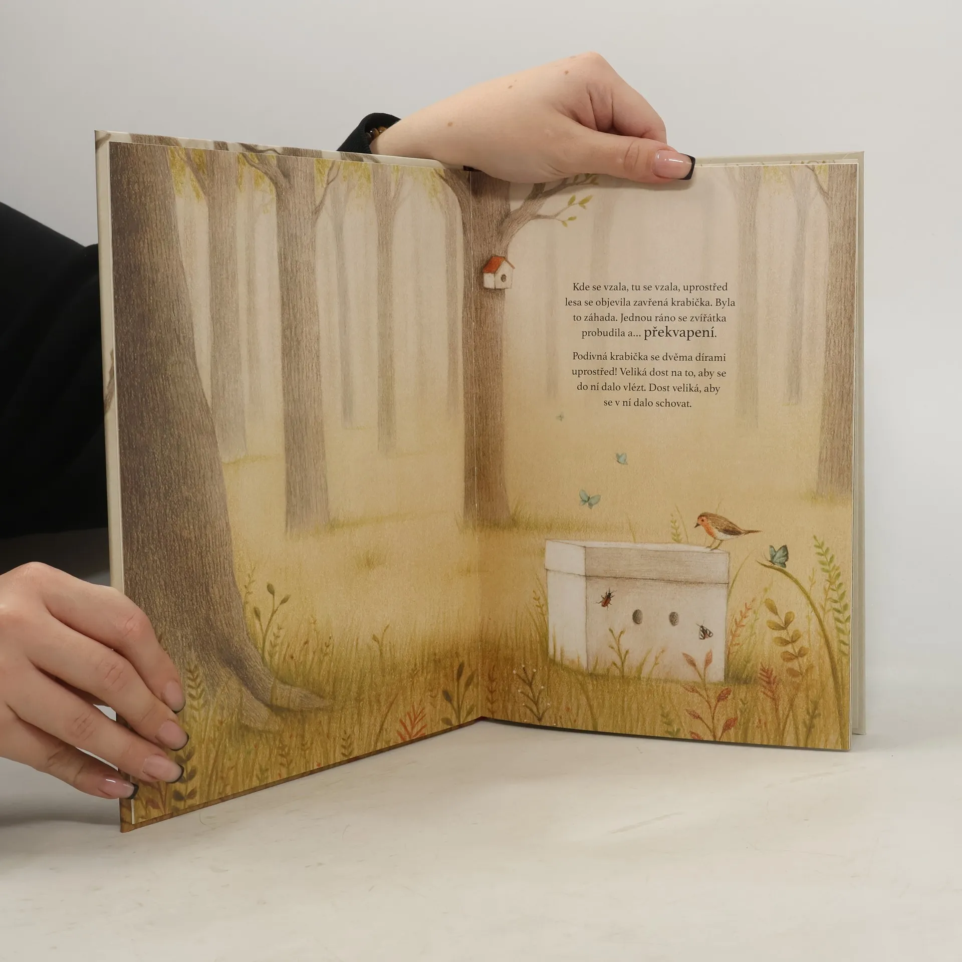V lese se najednou objevila krabička. Na jedné straně má dvě dírky a nikdo neví, jak se tam ocitla. Všechna zvířátka přemýšlejí o tom, proč se objevila právě v lese, nikdo ale nezná odpověď. Jedno je ale jisté: ať je tam kdokoli nebo cokoli, rozhodně nechce z krabičky ven. Půvabná knížka o tom, že na světě nejvíc potřebujeme kamarády, osloví děti od pěti let.