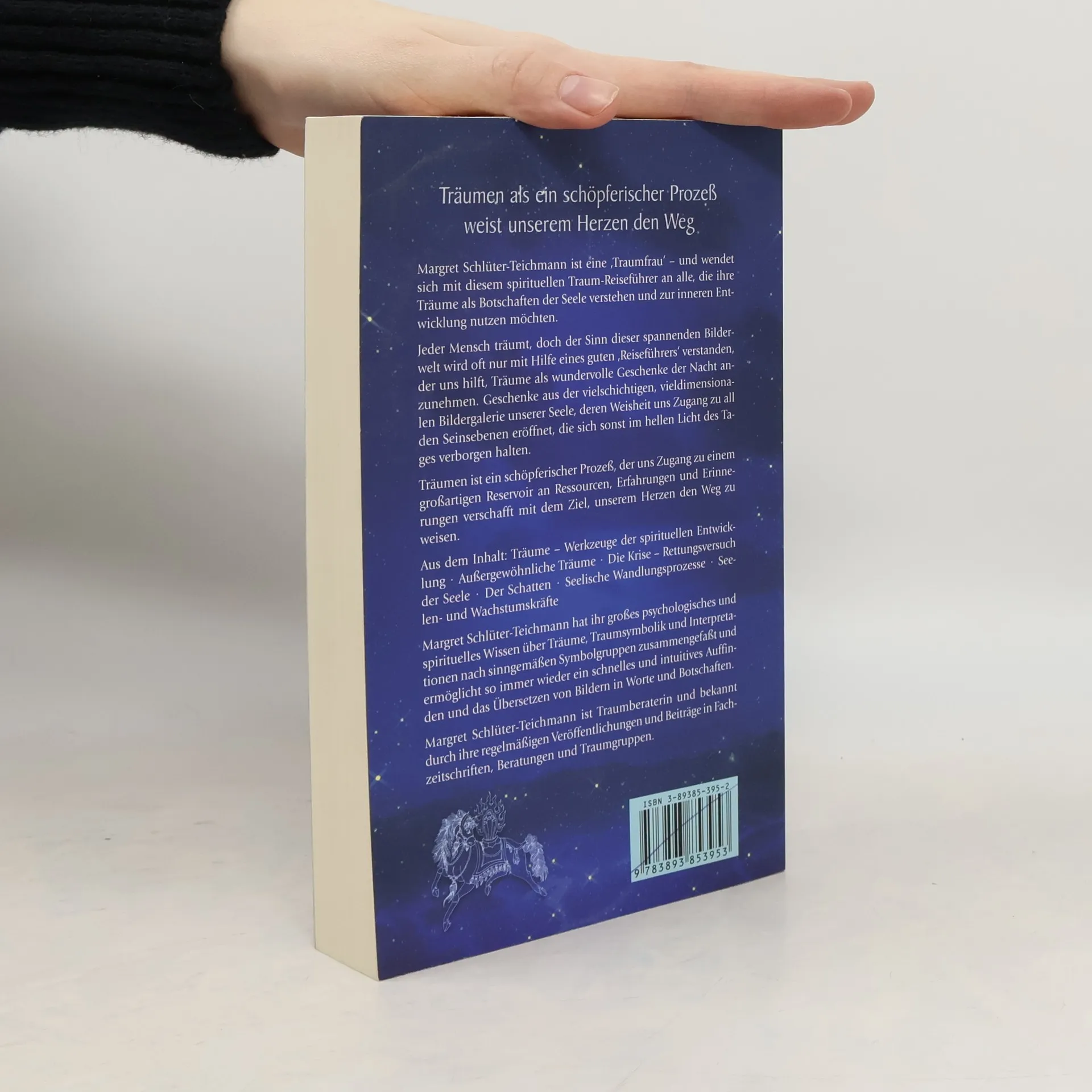 Margret Schlüter-Teichmann ist eine „Traumfrau“ - und wendet sich mit diesem spirituellen Traum-Rreiseführer an alle, die ihre Träume als Botschaften der Seele verstehen und zur inneren Entwicklung nutzen möchten. Jeder Mensch träumt, doch der Sinn dieser spannenden Bilderwelt wird oft nur mit Hilfe eines guten „Reiseführers“ verstanden, der uns hilft, Träume als wundervolle Geschenke der Nacht anzunehmen. Geschenke aus der vielschichtigen, vieldimensionalen Bildergalerie unserer Seele, deren Weisheit uns Zugang zu all den Seinsebenen eröffnet, die sich sonst im hellen Licht des Tages verborgen halten. Träumen ist ein schöpferischer Prozeß, der uns Zugang zu einem großartigen Reservoir an Ressourcen, Erfahrungen und Erinnerungen verschafft mit dem Ziel, unserem Herzen den Weg zu weisen. Aus dem Inhalt: Träume - Werkzeuge der spirituellen Entwicklung - Außergewöhnliche Träume - Die Krise, Rettungsversuch der Seele - Der Schatten - Seelische Wandlungsprozesse - Seelen- und WachstumskräfteMargret Schlüter-Teichmann hat ihr großes psychologisches und spirituelles Wissen über Träume, Traumsymoblik und Interpretationen nach sinngemäßen Symbolgruppen zusammengefaßt und ermöglicht so immer wieder ein schnelles und intuitives Auffinden und das Übersetzen von Bildern in Worte und Botschaften.