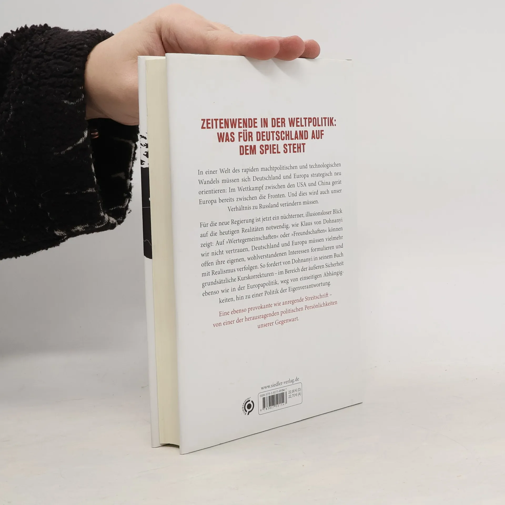Zeitenwende in der Weltpolitik: Was für Deutschland auf dem Spiel steht In einer Welt des rapiden machtpolitischen und technologischen Wandels müssen sich Deutschland und Europa strategisch neu orientieren: Im Wettkampf zwischen den USA und China gerät Europa bereits zwischen die Fronten. Und dies wird auch unser Verhältnis zu Russland verändern müssen. Jetzt ist ein nüchterner, illusionsloser Blick auf die neuen Realitäten notwendig, wie Klaus von Dohnanyi zeigt: Auf »Wertegemeinschaften« oder »Freundschaften« können wir nicht vertrauen, Deutschland und Europa müssen vielmehr offen ihre eigenen, wohl verstandenen Interessen formulieren und mit Realismus verfolgen. So fordert von Dohnanyi in seinem Buch grundsätzliche Kurskorrekturen – im Bereich der äußeren Sicherheit ebenso wie in der Industriepolitik, weg von einseitigen Abhängigkeiten, hin zu einer Politik der Eigenverantwortung. Ein ebenso provokantes wie anregendes Buch - von einer der herausragenden politischen Persönlichkeiten unserer Gegenwart.