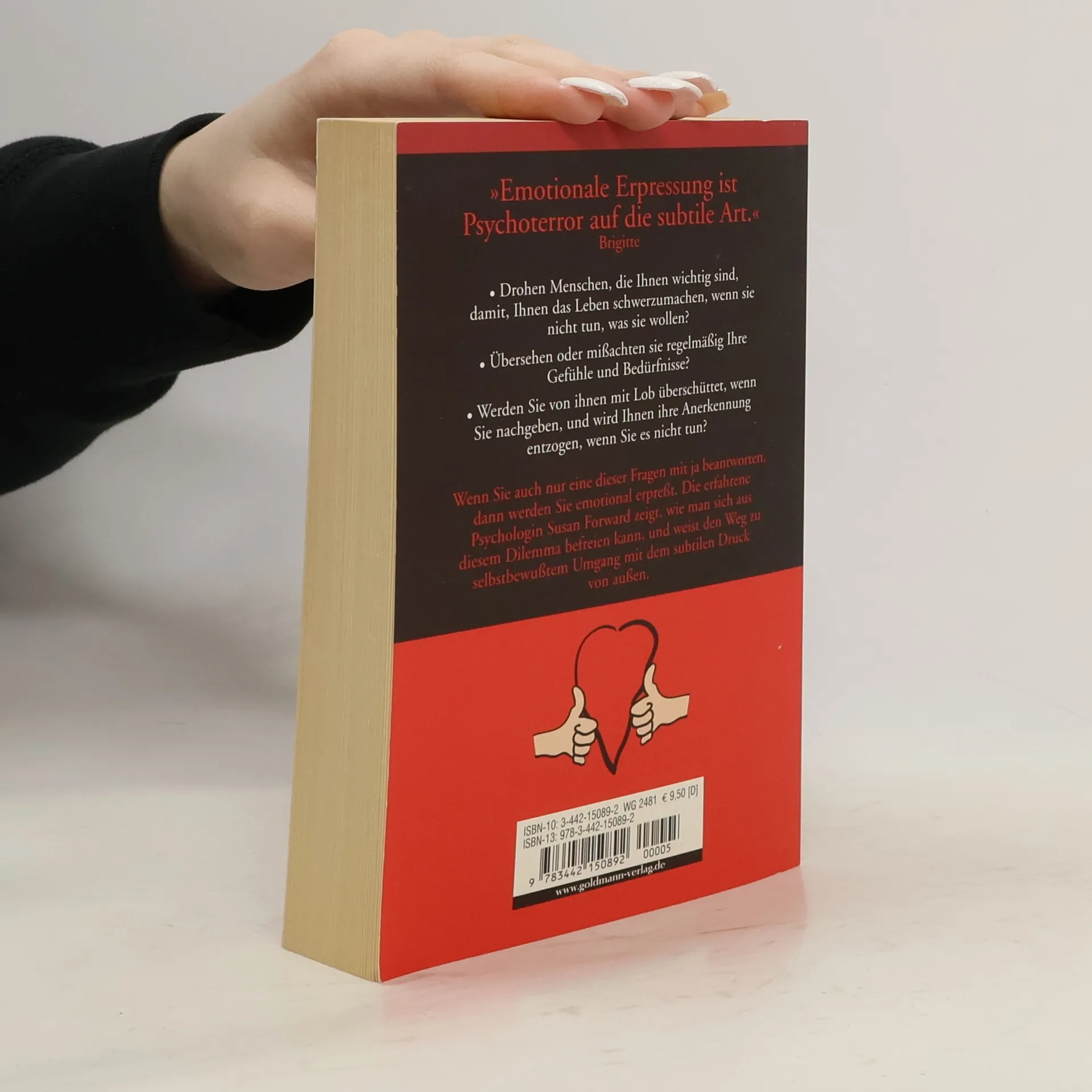 „Wenn du das tust, ist es aus mit uns.“ – "Du darfst mich nie verlassen, alleine schaff' ich das Leben nicht!„ – “Wenn du dich von mir scheiden lässt, siehst du deine Kinder nie wieder.„ – “Ich will doch nur dein Bestes!" Wer mit Gefühlen unter Druck gesetzt wird, kann sich nur schwer wehren. Schließlich steht die gute Beziehung auf dem Spiel. Doch gehören immer zwei dazu – wir entscheiden selbst, ob wir die Erpressung zulassen. Die renommierte Therapeutin Susan Forward veranschaulicht mit zahlreichen Fallbeispielen, wie die emontionale Manipulation funktioniert und wie wir uns daraus befreien können. Ein unentbehrlicher Ratgeber für alle, die sich in Zukunft erfolgreich vor dem 'sanften' Druck von außen schützen wollen.