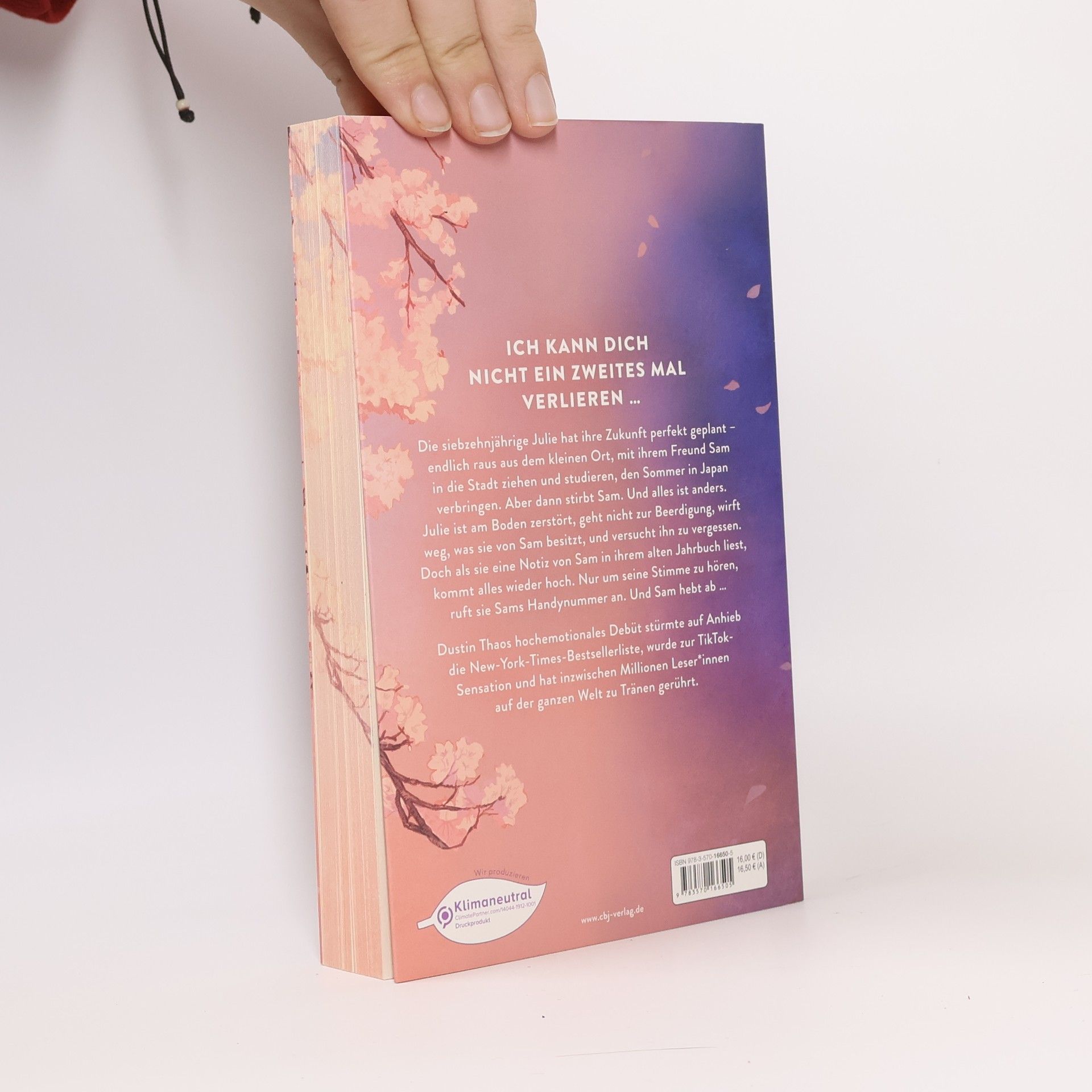 Ich kann dich nicht ein zweites Mal verlieren Die siebzehnjährige Julie hat ihre Zukunft perfekt geplant – endlich raus aus dem kleinen Ort, mit ihrem Freund Sam in die Stadt ziehen und studieren, den Sommer in Japan verbringen. Aber dann stirbt Sam. Und alles ist anders. Julie ist am Boden zerstört, geht nicht zur Beerdigung, wirft weg, was sie von Sam besitzt, und versucht ihn zu vergessen. Doch als sie eine Notiz von Sam in ihrem alten Jahrbuch liest, kommt alles wieder hoch. Nur um seine Stimme zu hören, ruft sie Sams Handynummer an. Und Sam hebt ab … Dustin Thaos hochemotionaler Debütroman über Liebe, Trauer und Verlust stürmte auf Anhieb die New-York-Times-Bestsellerliste, wurde zur TikTok-Sensation und hat inzwischen Millionen Leser*innen auf der ganzen Welt zu Tränen gerührt.