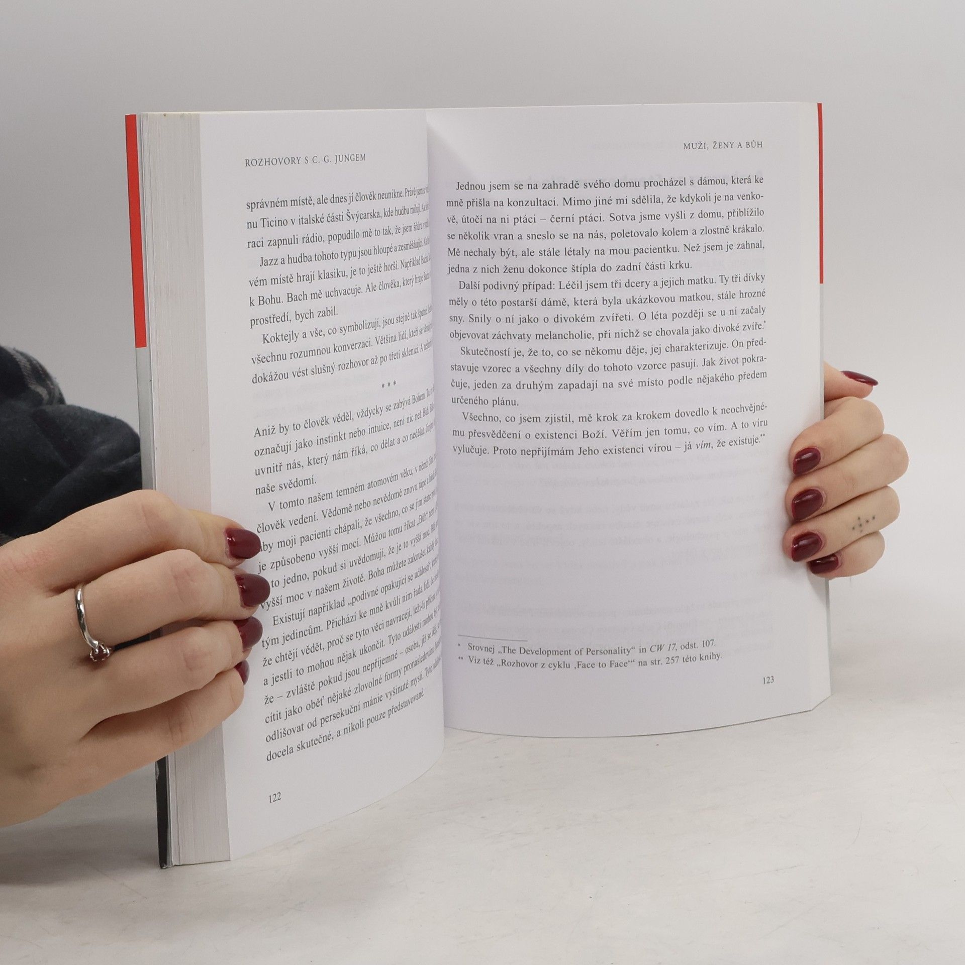 Rozhovory z let 1933–1961 jedinečným způsobem zachycují vývoj osobnosti C. G. Junga a jeho ducha. Soubor tvoří zhruba 20 interview pro noviny, časopisy, rozhlas i televizi. Obsažen je i rozhovor s Johnem Freemanem pro televizní stanici BBC, jenž proslul tím, že se v něm Jung svou slavnou větou „Nemusím věřit, ale vím“ vyjadřuje k víře v Boha. Jung v rozhovorech např. popisuje svůj vztah s Freudem a postoj ke klasické psychoanalýze, vyjadřuje názory na válečnou a poválečnou dobu (včetně odkazů na Československo), na německou mentalitu, odpovídá na obvinění, že kolaboroval s nacismem, vysvětluje základní alchymické koncepty, pojem archetypu či téma osobnostní typologie, zmiňuje se o své rodině. Rozhovory umožňují nahlédnout do způsobu, jakým Jung komunikoval, a odhalují informace, které se jinak v jeho knihách či statích hledají jen těžko.