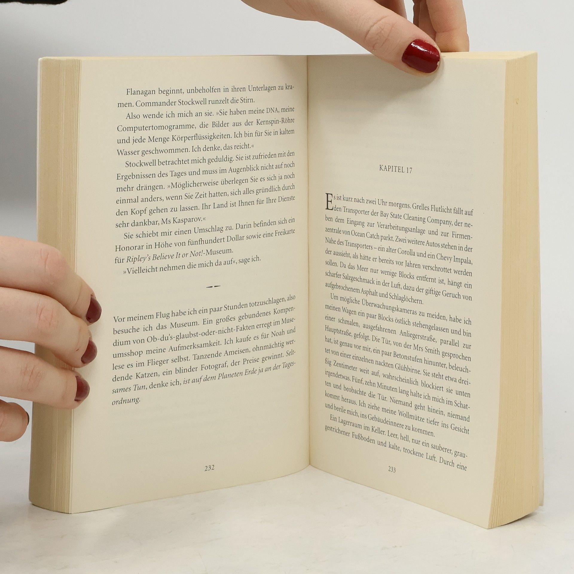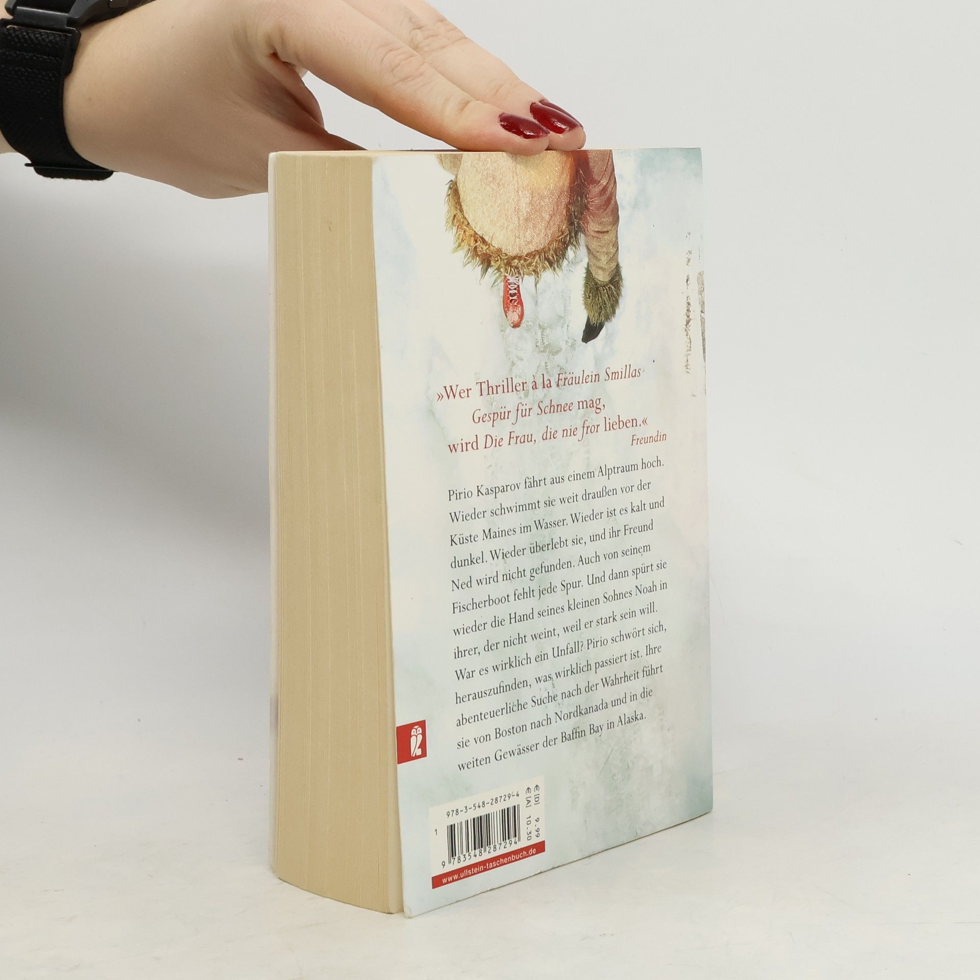 Pirio Kasparov fährt aus einem Alptraum hoch. Wieder schwimmt sie weit draußen vor der Küste Maines im Wasser. Wieder ist es kalt und dunkel. Wieder überlebt sie, und ihr Freund Ned wird nicht gefunden. Auch von seinem Fischerboot fehlt jede Spur. Und dann spürt sie wieder die Hand seines kleinen Sohnes Noah in ihrer, der nicht weint, weil er stark sein will. War es wirklich ein Unfall? Pirio schwört sich herauszufinden, was wirklich passiert ist. Ihre abenteuerliche Suche nach der Wahrheit führt sie von Boston nach Nordkanada und in die weiten Gewässer der Baffin Bay in Alaska.