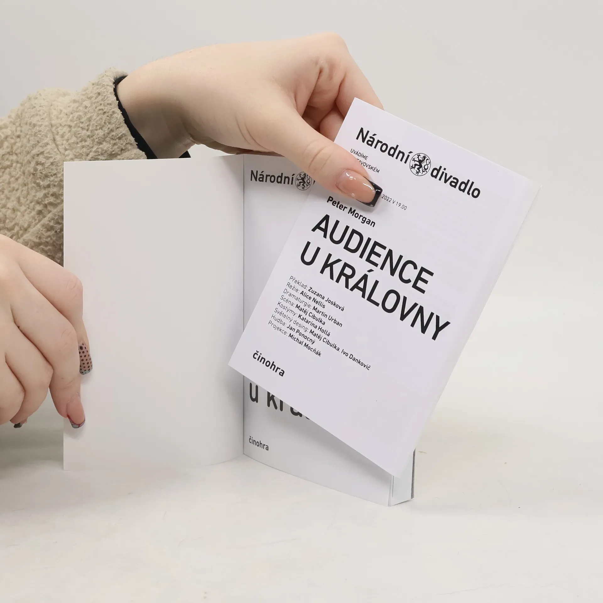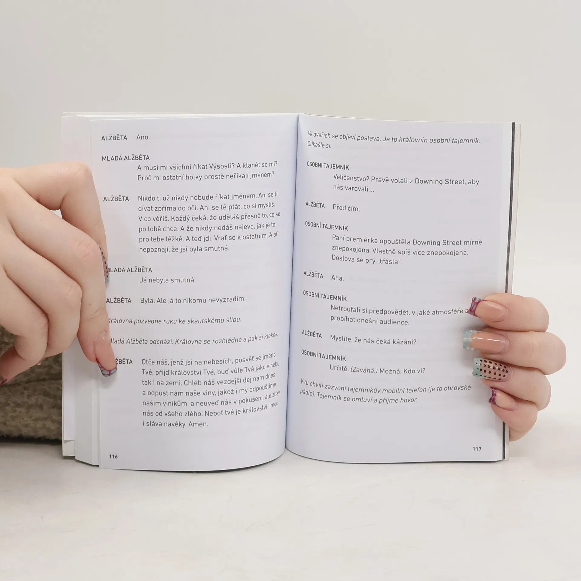 Její Veličenstvo Alžběta II., královna Spojeného království a dalších dominií britské koruny, je hlavní postavou této nové anglické hry. Je to trochu překvapující, ale nikoliv neobvyklé, podíváme-li se na dějiny dramatu v Anglii. Jeden den v týdnu přijímá královna své premiéry ke konzultacím. A právě ty jsou námětem hry, která je svým způsobem pohádkou o monarchii v moderním světě. Divadlem o každodenní politice a politicích obecně, byť jsou v této hře přítomni prakticky všichni konkrétní premiéři od Winstona Churchilla, přes Margaret Thatcherovou po Davida Camerona. Politika se všemi svými záludnostmi je konfrontována s jistým nadčasovým archaickým principem kontroly demokratické vlády. Ne, nejde tu o oslavu monarchie, byť vedle mnoha britských premiérů je hlavní hrdinkou právě Alžběta II. Jde o pohled na tíži politiky z jiného úhlu. Z úhlu, který neznáme.