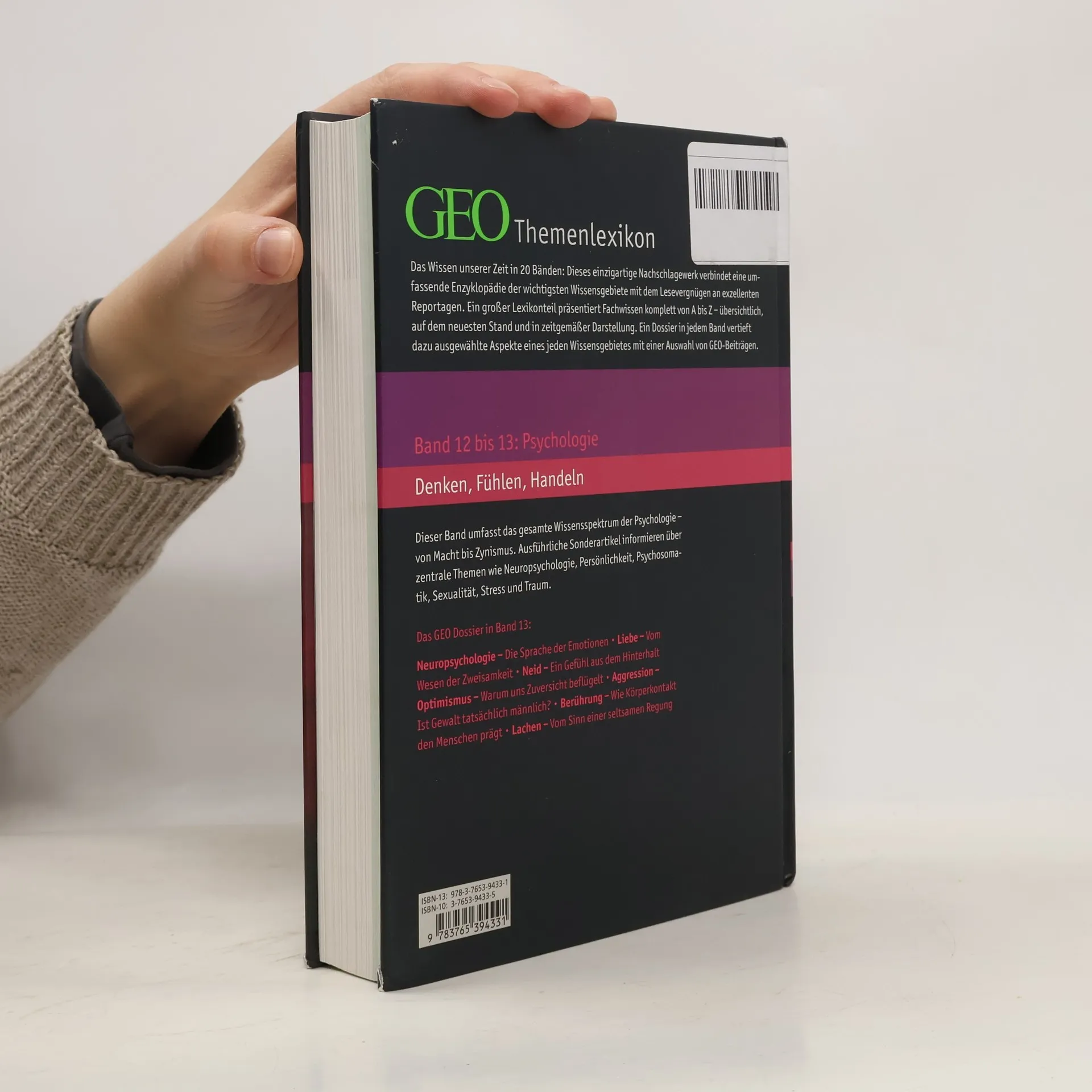 Das Wissen unserer Zeit in 20 Themenbänden: Dieses einzigartige und preisgünstige Nachschlagewerk ist eine Kooperation des Brockhaus-Verlages mit dem Wissenschaftsmagazin GEO und verbindet eine umfassende Enzyklopädie der wichtigsten Wissensgebiete mit dem Lesevergnügen an exzellenten Reportagen im GEO Dossier, das den alphabetischen Stichwortbestand eines jeden Bandes ergänzt. Die Bände 12 und 13 beschäftigen sich mit dem Themenbereich »Psychologie«.