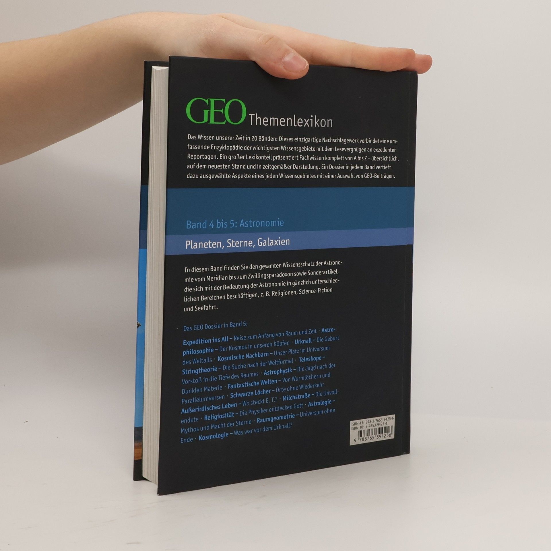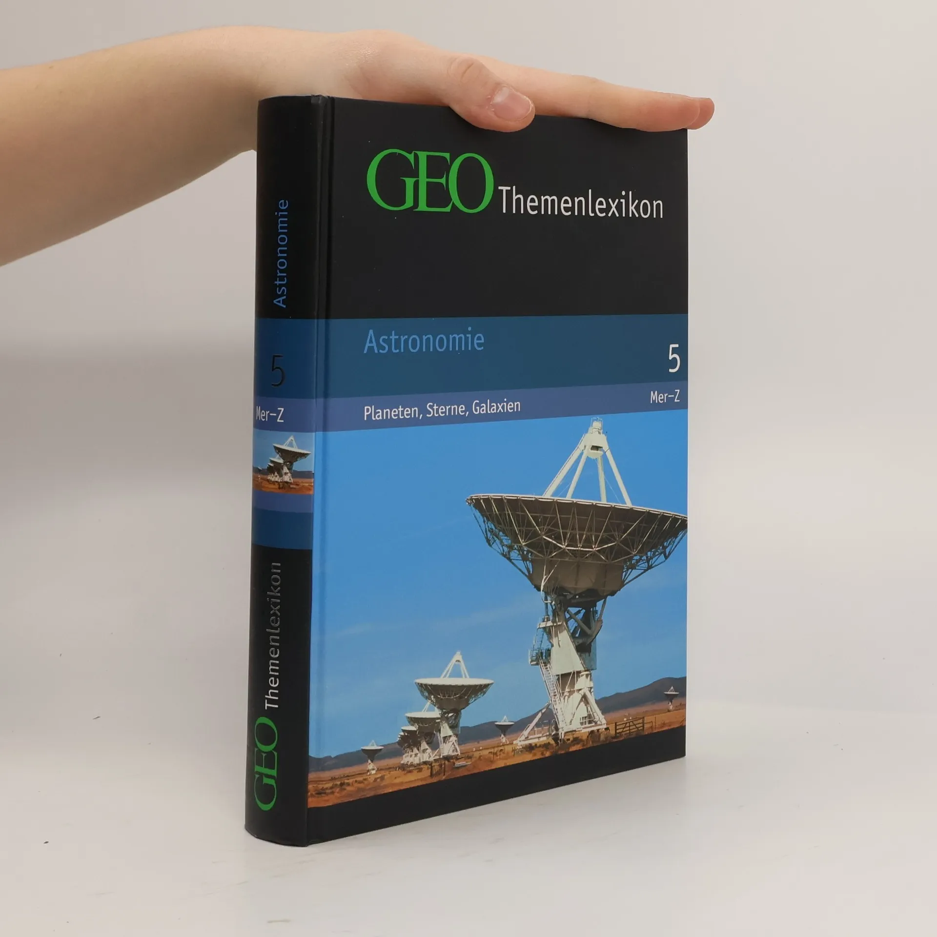 Band 5 Astronomie: Planeten, Sterne, Galaxien Merak bis ZZ-Ceti-Sterne GEO Dossier in diesem Band: Expedition ins All - Reise zum Anfang von Raum und Zeit; Astrophilosophie - Der Kosmos in unseren Köpfen; Urknall - Der Geburt des Weltalls; Kosmische Nachbarn - Unser Platz im Universum; Stringtheorie - Die Suche nach der Weltformel; Teleskope - Vorstoß in die Tiefe des Raumes; Astrophysik - Die Jagd nach der Dunklen Materie; Fantastische Welten - Von Wurmlöchern und Paralleluniversen; Schwarze Löcher - Orte ohne Wiederkehr; Außerirdisches Leben - Wo steckt E.T.?; Milchstraße - Die Unvollendete; Religiosität - Die Physiker entdecken Gott; Astrologie - Mythos und Macht der Sterne; Raumgeometrie - Universum ohne Ende; Kosmologie - Was war vor dem Urknall?