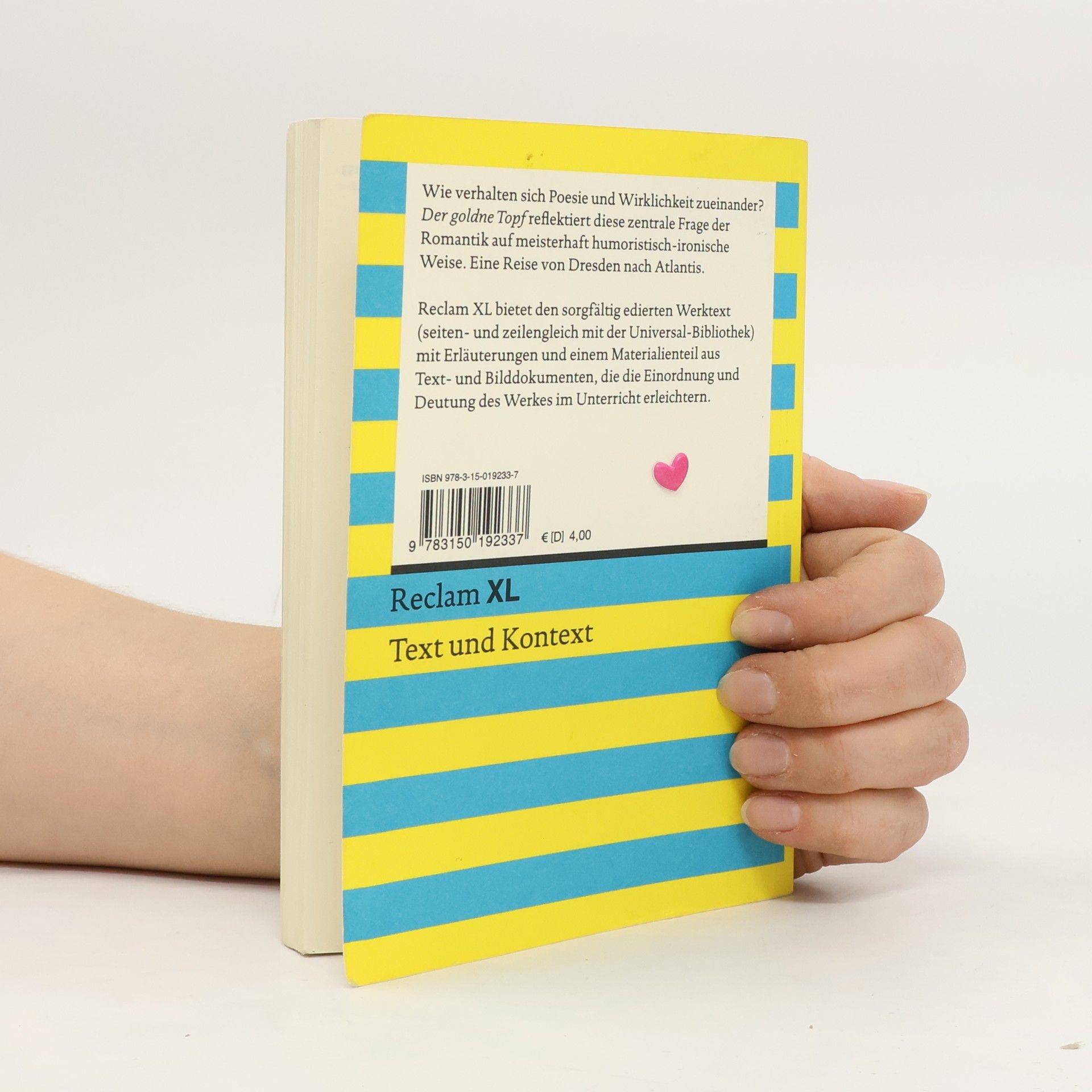 Klassenlektüre und Textarbeit einfach gemacht: Die Reihe »Reclam XL – Text und Kontext« erfüllt alle Anforderungen an Schullektüre und Bedürfnisse des Deutschunterrichts: * Das Format ist größer als die gelben Klassiker der Universal-Bibliothek, mit ausreichend Platz für Notizen am Seitenrand. * Schwierige Wörter werden am Fuß jeder Seite erklärt, ausführlichere Wort- und Sacherläuterungen stehen im Anhang. * Zusatz-Materialien im Anhang erleichtern das Verständnis des Werkes und liefern Impulse für Diskussionen im Unterricht: zu Quellen und Stoff, Biographie des Autors, Epoche und Rezeptionsgeschichte. »Der goldne Topf«, E. T. A. Hoffmanns »Märchen aus der neuen Zeit«, spielt virtuos mit den Ebenen des Wunderbaren und des Bürgerlich-Philiströsen. Der Weg des Studenten Anselmus von Dresden nach Atlantis wird phantasievoll-humoristisch erzählt und zugleich ironisch reflektiert. Seit langem und mit Recht gilt das Kunstmärchen als ein Höhepunkt romantischer Erzählkunst. Die Bände von Reclam XL sind im Textteil seiten- und zeilenidentisch mit den gelben Ausgaben der Universal-Bibliothek. UB- und XL-Ausgaben sind also nicht nur im Unterricht nebeneinander verwendbar – es passen auch weiterhin alle Lektüreschlüssel, Erläuterungsbände und Interpretationen dazu.