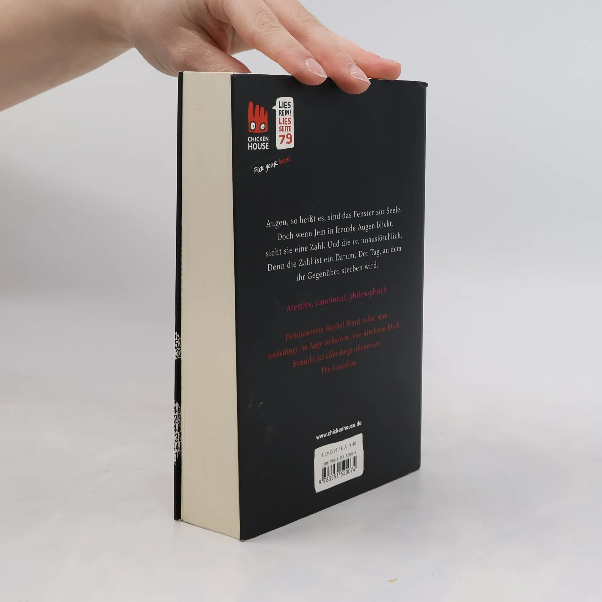 Augen, so heißt es, sind das Fenster zur Seele. Doch wenn Jem in fremde Augen blickt, sieht sie eine Zahl. Und die ist unauslöschlich. Denn die Zahl ist ein Datum. Der Tag, an dem ihr Gegenüber sterben wird. Diese Gewissheit hat Jem seit dem Tod ihrer Mutter. Deshalb meidet sie Menschen. Ist am liebsten allein. Bis sie Spinne kennenlernt - und mit ihm das Leben. Jem ist glücklich, zum ersten Mal. Doch als die beiden zum Riesenrad, dem London Eye fahren, passiert es - um sie herum haben alle dieselbe Zahl. Jem weiß: Etwas Furchtbares wird passieren. Heute. Hier. Fluchtartig verlassen Spinne und sie das Gelände. Und lösen damit eine Kettenreaktion aus. Spinne und Jem werden zu Gejagten. Von der Polizei, den Medien, den Menschen. Und Spinnes Todestag rückt näher und näher.