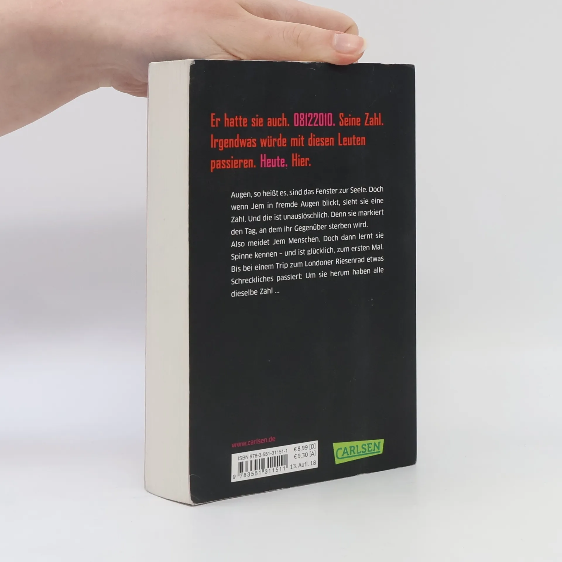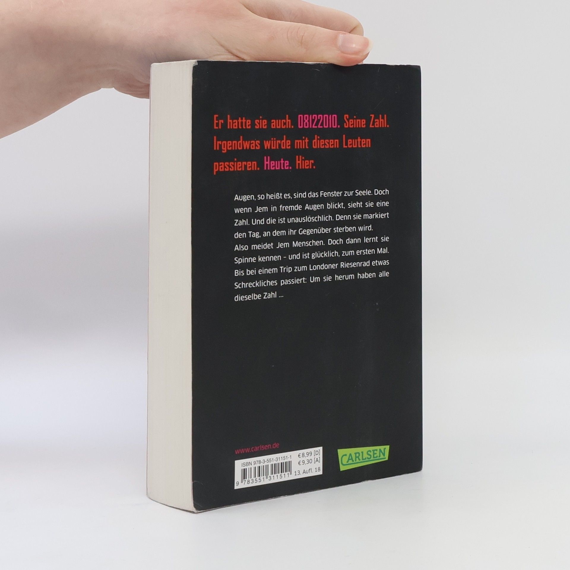 Wenn Jem in fremde Augen blickt, sieht sie eine Zahl. Genauer gesagt: ein Datum. Das Datum, an dem ihr Gegenüber sterben wird. Seit Jem das weiß, ist sie am liebsten allein. Bis sie Spinne kennenlernt – und mit ihm das Leben. Sie ist glücklich, zum ersten Mal. Doch als die beiden zum London Eye, dem Riesenrad, fahren, passiert es: Um sie herum tragen alle dieselbe Zahl. Jem weiß: Etwas Furchtbares wird passieren. Heute. Hier. Fluchtartig verlassen Spinne und sie das Gelände – und werden zu Gejagten … Ein atemberaubender Thriller mit Tiefgang, nominiert für den Jugendliteraturpreis