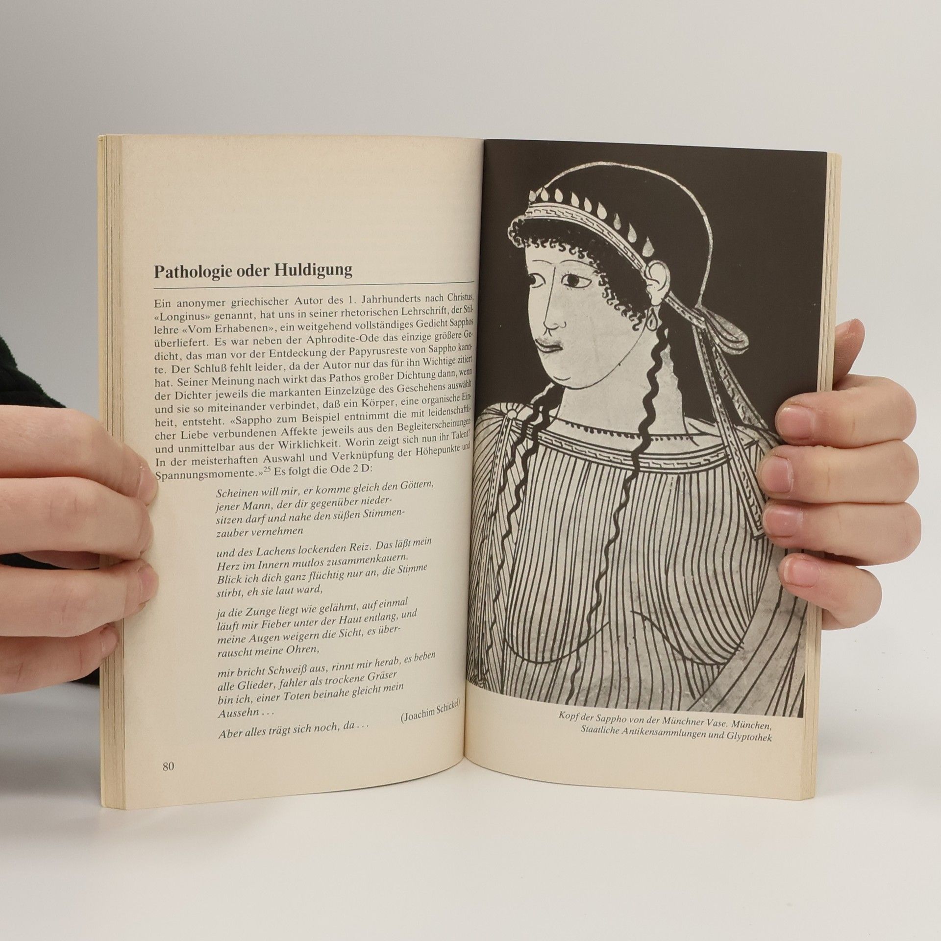 Sappho von Lesbos, die frühgriechische Dichterin, gilt seit jeher als Meisterin, ja als Inbegriff lyrischer Poesie. Zu allen Zeiten wurde ihre Kunst gepriesen: von Platon, Catull, Horaz über Friedrich Schlegel bis hin zu Marie Luise Kaschnitz. Während bis heute keine Anthologie abendländischer Lyrik ohne Sapphos Gedichte auskommt, ist das Interesse an ihrer Person vielfach vom Sapphischen auf das Lesbische verlagert, oft erschöpft es sich sogar darin. Der fragmentarische Erhaltungszustand ihrer Gedichte und die spärlichen Lebensdaten trugen schon seit der Antike dazu bei, daß die Gestalt der Dichterin hinter einem Schleier von Fabeleien und Legenden fast völlig verschwand. So wurde sie zu einer „bekannten Unbekannten der Weltliteratur“ (Schadewaldt).