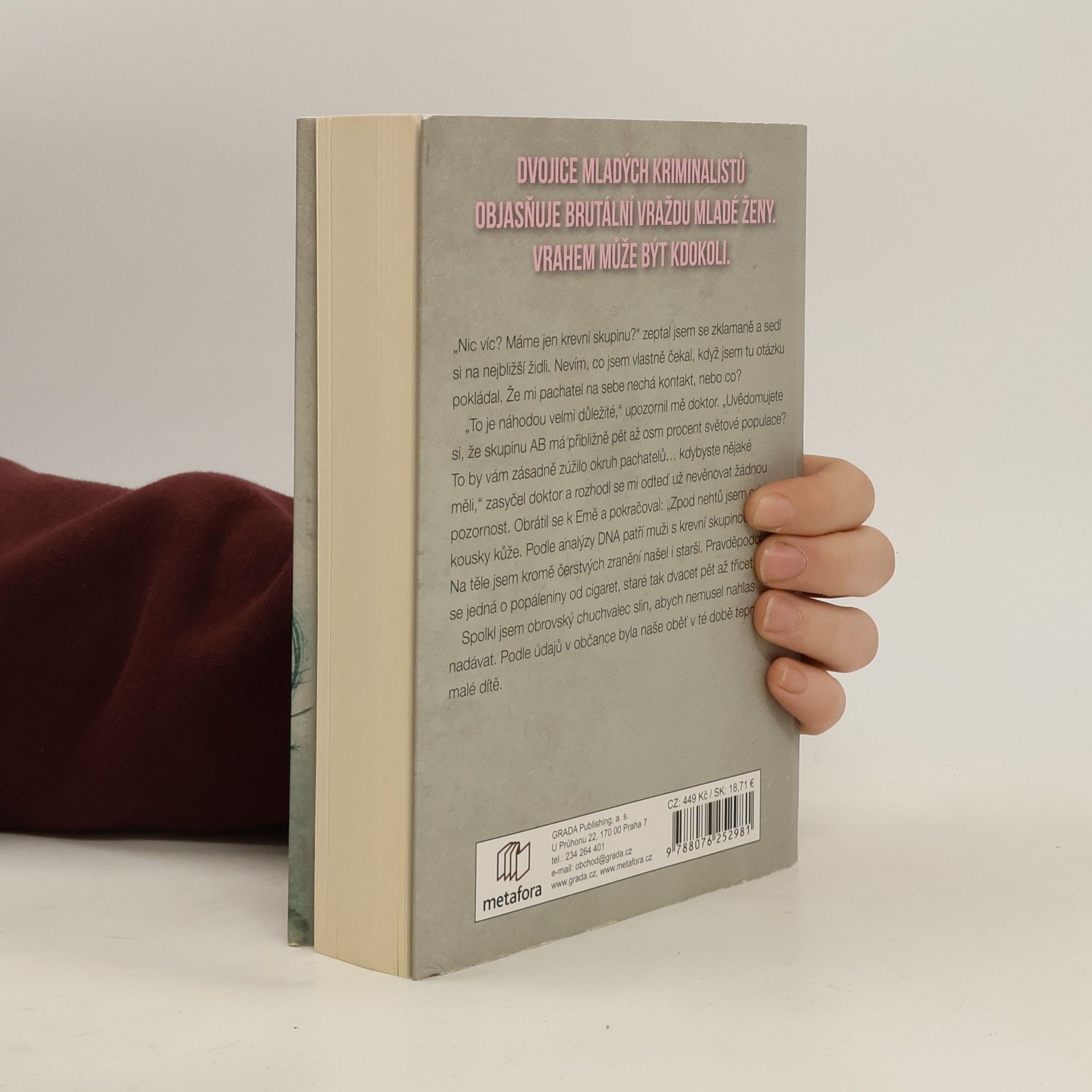 V bohem zapomenuté chatové osadě na východním Slovensku nacházejí dva mladíci zavražděnou ženu. Její totožnost je velkou neznámou. Případ řeší svérázný detektiv David Meizner, věčně nevrlý a nepříjemný sukničkář, který nemá lidi příliš v lásce, a jeho krásná a věcná kolegyně Ema Kopecká. Aby odhalili totožnost vraha, musejí se společně prodrat pavučinou utkanou z dávných tajemství. Jejich pátrání se však komplikuje…Drama plné zvratů a nečekaných událostí se hemží podezřelými postavami z minulosti i současnosti, dávno zapomenutými hříchy, ale i bolestí a utrpením, které musela malá holčička a později mladá žena prožít. Děj nás postupně zavede do malé vesničky pod Tatrami, aby pokračoval do hlavního města a zpět na místo, kde měla hlavní hrdinka nečekanou schůzku se smrtí. Příběh rozehraný postavami z masa a krve je napínavý až do samotného konce a překvapí nečekaným rozuzlením.Vychází v překladu Ľubici Hricoviniové.
