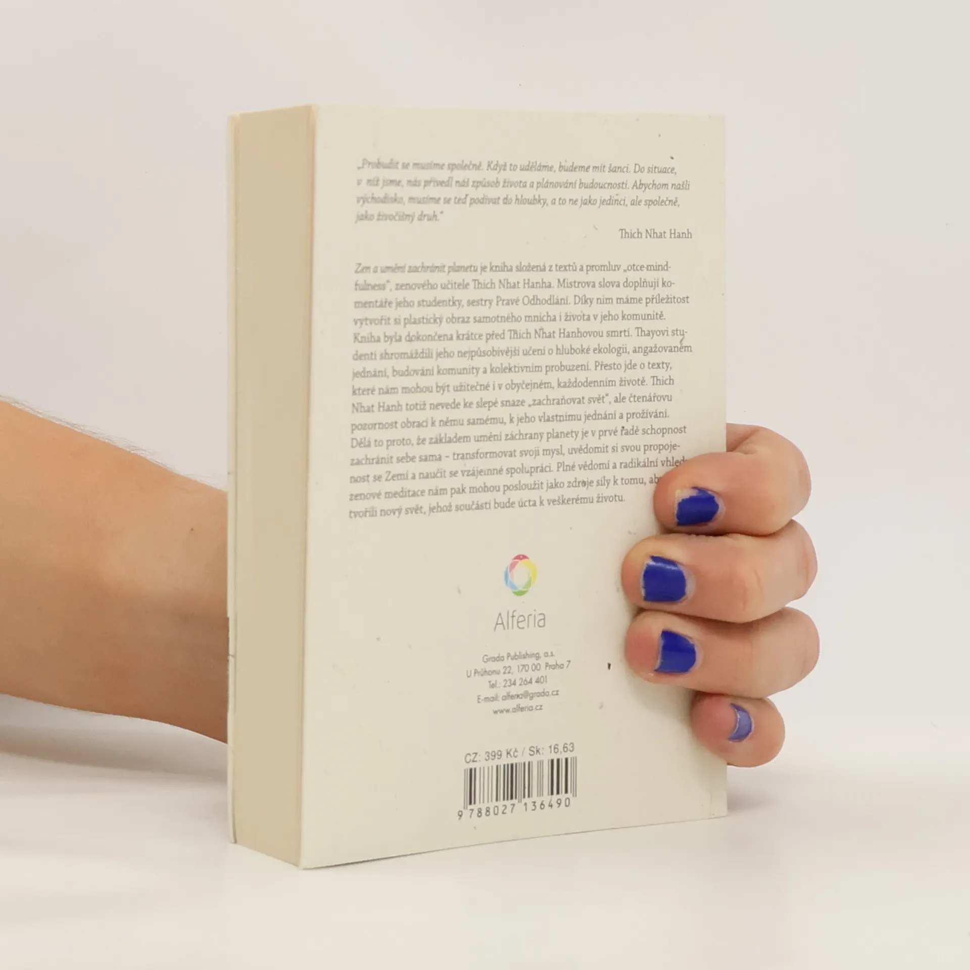 Zen a umění zachránit planetu je kniha složená z textů a promluv „otce mindfulness“, zenového učitele Thich Nhat Hanha. Mistrova slova doplňují komentáře jeho studentky, sestry Pravé Odhodlání. Díky nim máme příležitost vytvořit si plastický obraz samotného mnicha i života v jeho komunitě. Kniha byla dokončena krátce před Thich Nhat Hanhovou smrtí. Thayovi studenti shromáždili jeho nejpůsobivější učení o hluboké ekologii, angažovaném jednání, budování komunity a kolektivním probuzení. Přesto jde o texty, které nám mohou být užitečné i v obyčejném, každodenním životě. Thich Nhat Hanh totiž nevede ke slepé snaze „zachraňovat svět“, ale čtenářovu pozornost obrací k němu samému, k jeho vlastnímu jednání a prožívání. Dělá to proto, že základem umění záchrany planety je v prvé řadě schopnost zachránit sebe sama – transformovat svoji mysl, uvědomit si svou propojenost se Zemí a naučit se vzájemné spolupráci. Plné vědomí a radikální vhledy zenové meditace nám pak mohou posloužit jako zdroje síly k tomu, abychom tvořili nový svět, jehož součástí bude úcta k veškerému životu.
