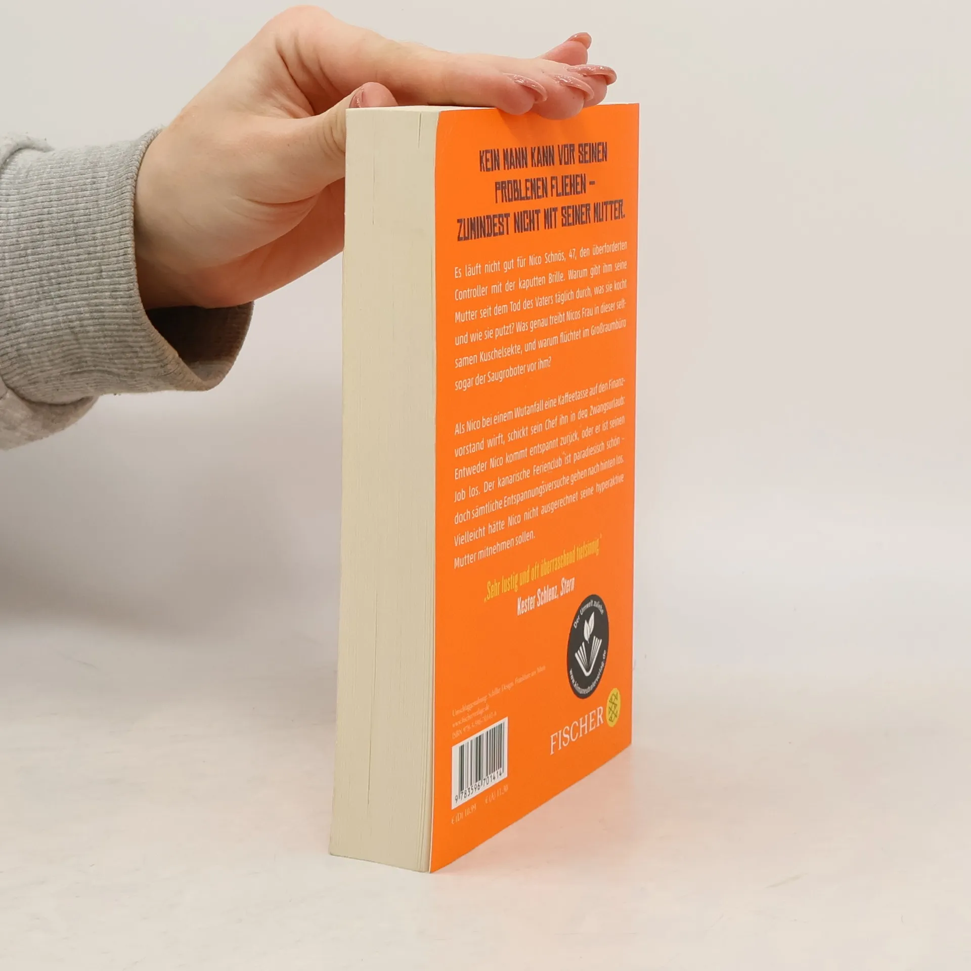 Kein Mann kann vor seinen Problemen fliehen – zumindest nicht mit seiner Mutter. Es läuft nicht gut für Nico Schnös, 47, den überforderten Controller mit der kaputten Brille. Warum gibt ihm seine Mutter seit dem Tod des Vaters täglich durch, was sie kocht und wie sie putzt? Was genau treibt Nicos Frau in dieser seltsamen Kuschelsekte, und warum flüchtet im Großraumbüro sogar der Saugroboter vor ihm? Als er bei einem Wutanfall eine Kaffeetasse auf den Finanzvorstand wirft, schickt sein Chef ihn in den Zwangsurlaub: Entweder Nico kommt entspannt zurück, oder er ist seinen Job los. Der kanarische Ferienclub ist paradiesisch schön – doch sämtliche Entspannungsversuche gehen nach hinten los. Vielleicht hätte Nico nicht ausgerechnet seine hyperaktive Mutter mitnehmen sollen: »Eine Zimmerkarte reicht, mein Sohn und ich machen eh alles zusammen!« Bald schon ahnt Nico: Paradies und Hölle können sehr nah beieinander liegen. Der Roman für alle, die schon mal mit ihren Eltern im Urlaub waren.