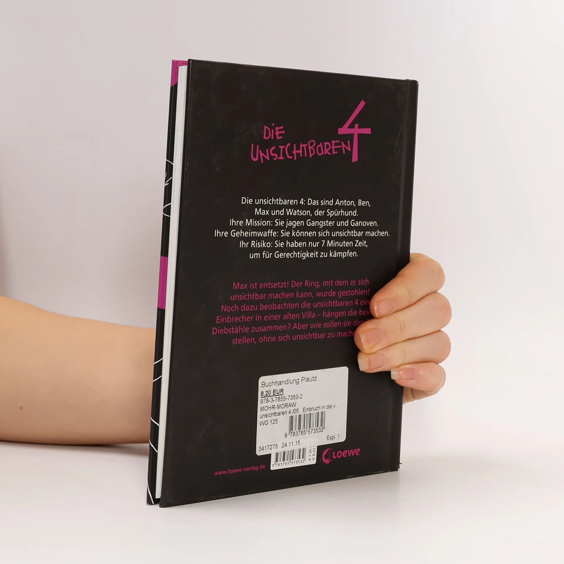 Die unsichtbaren 4: Das sind Anton, Ben, Max und Watson, der Spürhund. Ihre Mission: Sie jagen Gangster und Ganoven. Ihre Geheimwaffe: Sie können sich unsichtbar machen. Ihr Risiko: Sie haben nur 7 Minuten Zeit, um für Gerechtigkeit zu kämpfen. Max ist entsetzt! Der Ring, mit dem er sich unsichtbar machen kann, wurde gestohlen! Noch dazu beobachten die unsichtbaren 4 einen Einbrecher in einer alten Villa - hängen die beiden Diebstähle zusammen? Aber wie sollen sie den Täter stellen, ohne sich unsichtbar zu machen?