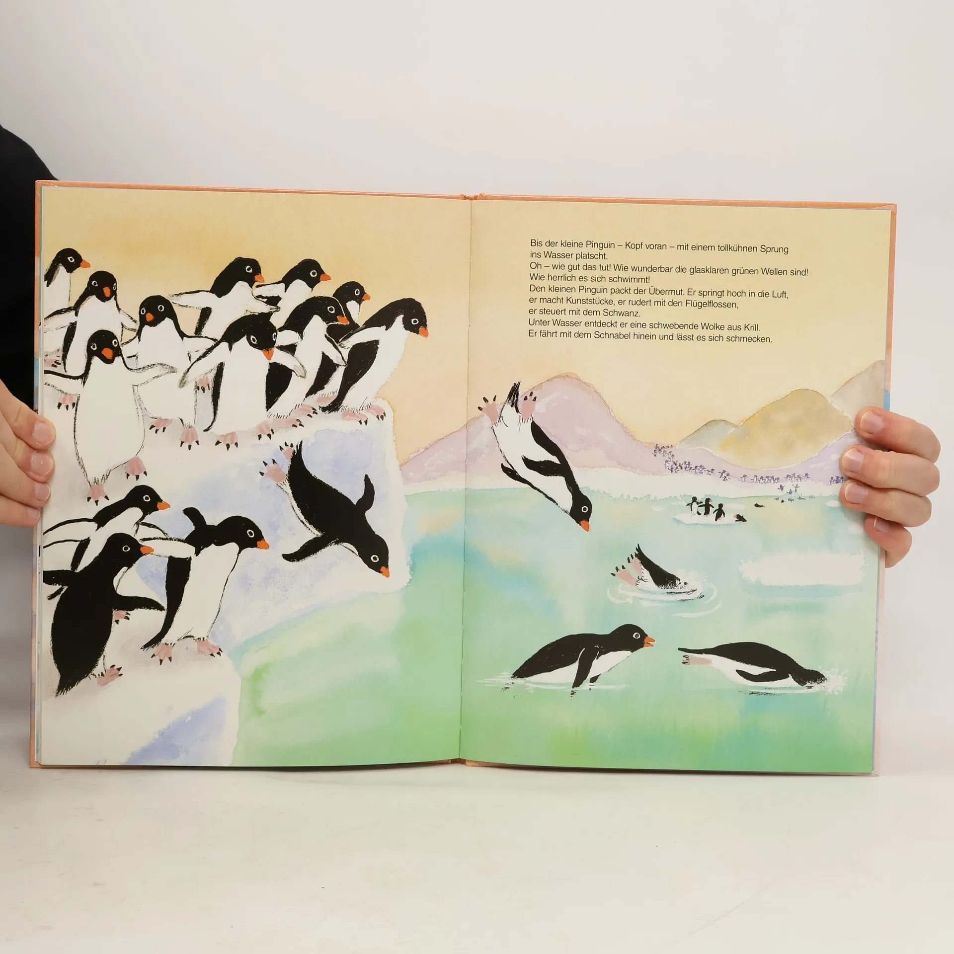 Der kleine Pinguin wird erwachsen. Dabei muss er alles lernen, was später für ihn wichtig ist: Er hört von den Skuas, die Raubmöwen sind und seine Feinde; er weiß bald, dass nur seine Eltern ihm Futter bringen und er muss sich in die Gemeinschaft mit den anderen Pinguinkindern einfügen. Spätestens als er Hoppala trifft, das Pinguinmädchen, das ihm sehr gefällt, weiß er auch, dass es schön ist, wenn man mit jemandem teilen kann.