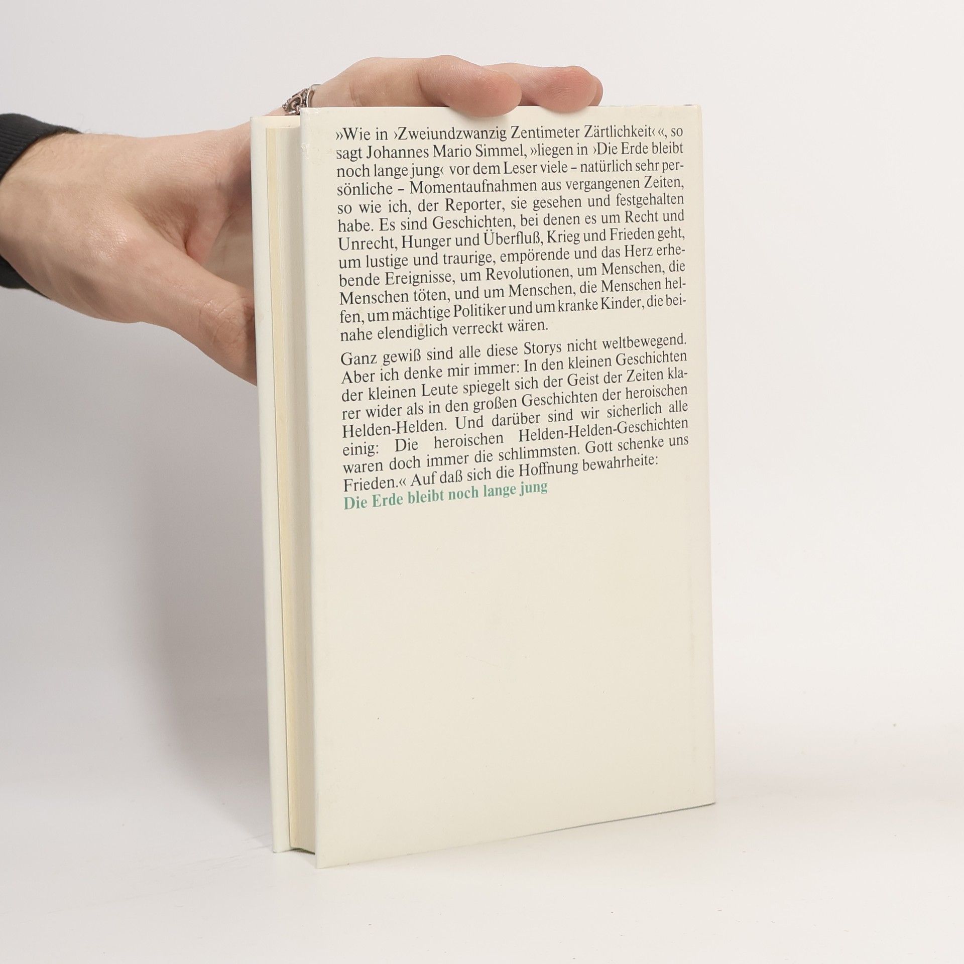 »Wie in Zweiundzwanzig Zentimeter Zärtlichkeit ,« so sagt Johannes Mario Simmel, »liegen in Die Erde bleibt noch lange jung vor dem Leser viele - natürlich sehr persönliche - Momentaufnahmen aus vergangenen Zeiten, so wie ich, der Reporter, sie gesehen und festgehalten habe. Es sind Geschichten, bei denen es um Recht und Unrecht, Hunger und Überfluß, Krieg und Frieden geht, um lustige und traurige, empörende und das Herz erhebende Ereignisse, um Revolutionen, um Menschen, die Menschen töten, und um Menschen, die Menschen helfen, um mächtige Politiker und um kranke Kinder, die beinahe elendiglich verreckt wären. Ganz gewiß sind alle diese Storys nicht weltbewegend. Aber ich denke mir immer: In den kleinen Geschichten der kleinen Leute spiegelt sich der Geist der Zeiten klarer wider als in den großen Geschichten der heroischen Helden-Helden. Und darüber sind wir sicherlich alle einig: Die heroischen Helden-Helden-Geschichten waren doch immer die schlimmsten. Gott schenke uns Frieden.«
