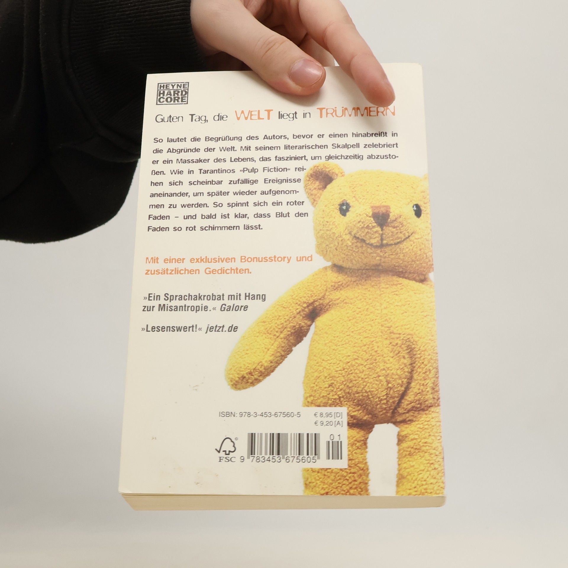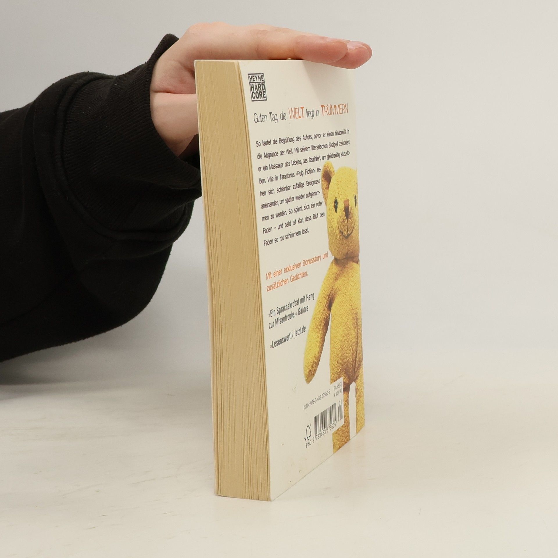 „Guten Tag, die Welt liegt in Trümmern.“ So lautet die Begrüßung des Autors, bevor er einen hinabreißt in die Abgründe der Welt. Mit seinem literarischen Skalpell zelebriert er ein Massaker des Lebens, das fasziniert, um gleichzeitig abzustoßen. Wie in Tarantinos „Pulp Fiction“ reihen sich scheinbar zufällige Ereignisse aneinander, um später wieder aufgenommen zu werden. So spinnt sich ein roter Faden – und bald ist klar, dass Blut den Faden so rot schimmern lässt. Mit einer exklusiven Zusatzstory