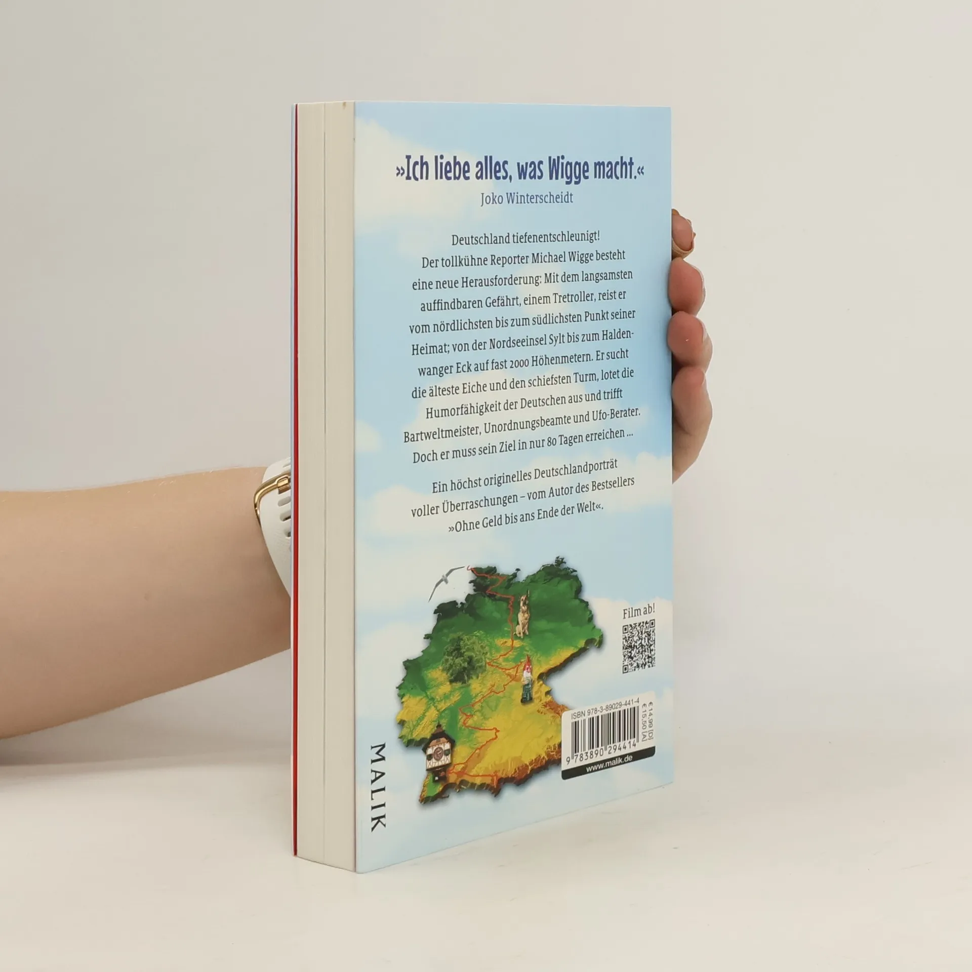 Entschleunigung mal anders - Michael Wigge will mit seinem Tretroller Ferdinand vom nördlichsten bis zum südlichsten Punkt Deutschlands gelangen; von der idyllischen Nordseeinsel Sylt bis zum Haldenwanger Eck auf fast 2000 Höhenmetern. Er sucht nach Superlativen wie der ältesten Eiche, der größten Kuckucksuhr und dem schiefsten Turm. Trifft Ufo-Forscher und Weltmeister im Kunstbügeln, findet Radarblitzer in Fußgängerzonen und landet urplötzlich in Kalifornien und Brasilien. Bizarre und außergewöhnliche Begegnungen entschädigen den Autor für die mühsame Art der Fortbewegung – doch ihm bleiben nur 80 Tage, um sein Ziel zu erreichen. Ein höchst originelles Deutschlandporträt voller Überraschungen.