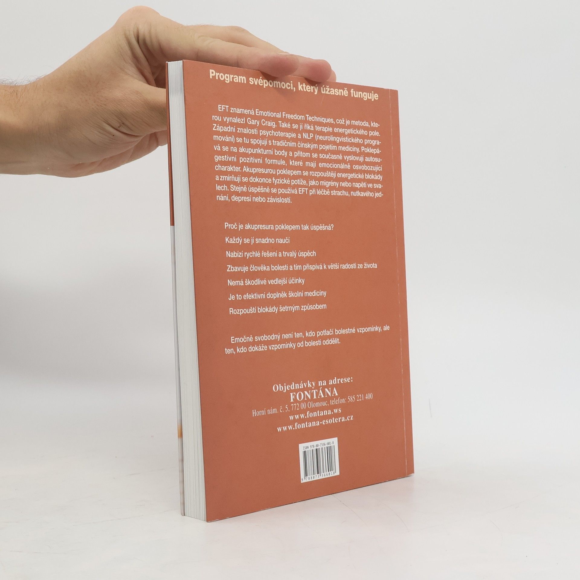 Program svépomoci, který úžasně funguje EFT znamená Emotional Freedom Techniques, což je metoda,kterou vynalezl Gary Craig. Také se jí říká terapie energetického pole. Západní znalosti psychoterapie a NLP eurolingvistického programování) se tu spojují s tradičním čínským pojetím medicíny. Poklepává se na akupunkturní body a přitom se současně vyslovují autosugestivní pozitivní formule, které mají emocionálně osvobozující charakter. Akupresurou poklepem se rozpouštějí energetické blokády a zmírňují se dokonce fyzické potíže, jako migrény nebo napětí ve svalech. Stejně úspěšně se používá EFT při léčbě strachu, nutkavého jednání, depresí nebo závislostí. Proč je akupresura poklepem tak úspěšná? Každý se jí snadno naučí Nabízí rychlé řešení a trvalý úspěch Zbavuje člověka bolesti a tím přispívá k větší radosti ze života Nemá škodlivé vedlejší účinky. Je to efektivní doplněk školní medicíny. Rozpouští blokády šetrným způsobem. Emočně svobodný není ten, kdo potlačí bolestné vzpomínky, ale ten, kdo dokáže vzpomínky od bolesti oddělit.