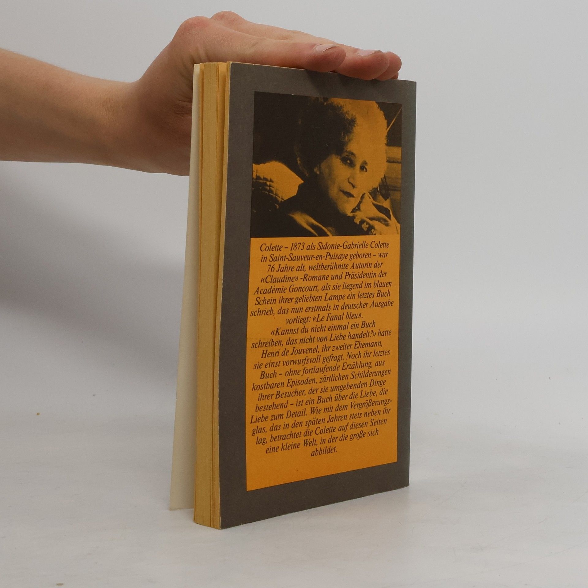 Colette war 76 Jahre alt, weltberühmte Autorin der «Claudine»-Romane und Präsidentin der Académie Goncourt, als sie liegend im blauen Schein ihrer geliebten Lampe ein letztes Buch «Le Fanal bleu».«Kannst du nicht einmal ein Buch schreiben, das nicht von Liebe handelt?» hatte Henri de Jouvenel, ihr zweiter Ehemann, sie einst vorwurfsvoll gefragt. Noch ihr letztes Buch – ohne fortlaufende Erzählung, aus kostbaren Episoden, zärtlichen Schilderungen ihrer Besucher, der sie umgebenden Dinge bestehend – ist ein Buch über die Liebe, die Liebe zum Detail. Wie mit dem Vergrößerungsglas, das in den späten Jahren stets neben ihr lag, betrachtet die Colette auf diesen Seiten eine kleine Welt, in der die große sich abbildet.