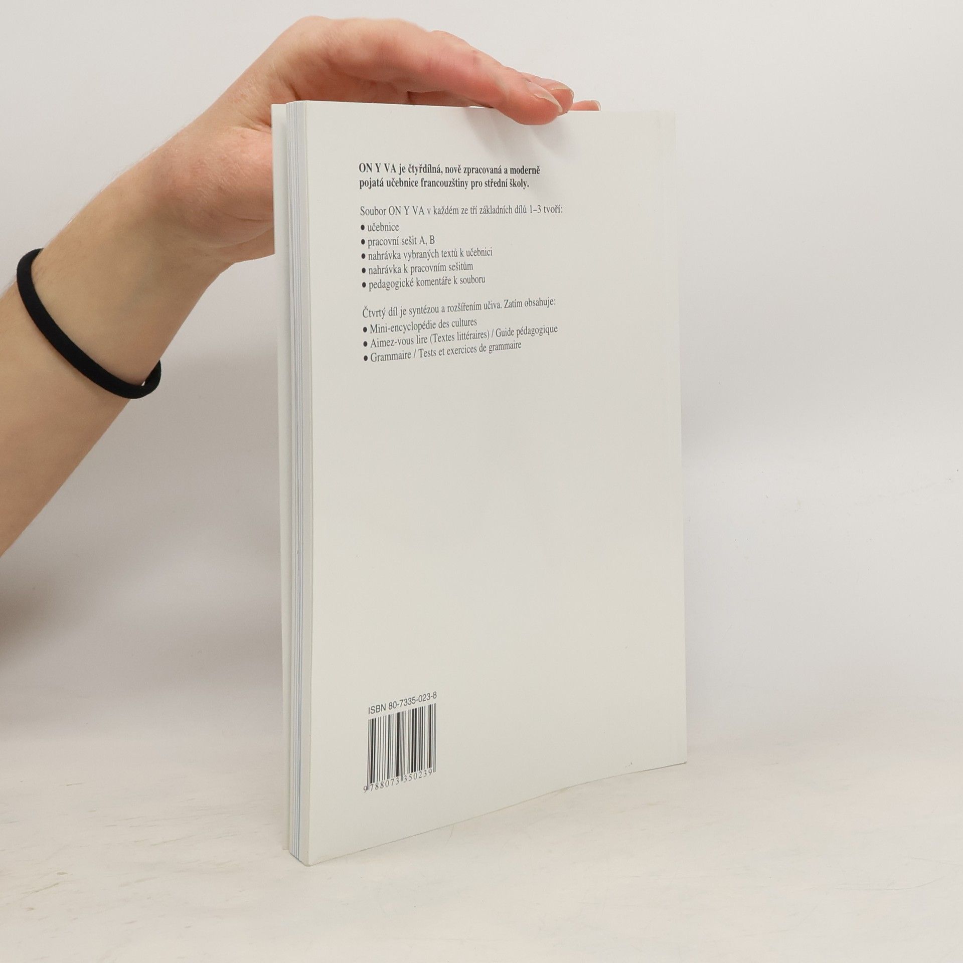 Tři vydané díly čtyřdílného učebnicového kompletu pro studenty, kteří hodlají po čtyřletém studiu z tohoto jazyka maturovat. Učebnice je založena na srovnání francouzštiny jako cizího jazyka s češtinou a sleduje dvojí cíl: položit pevný základ komunikativní a jazykové kompetence umožňující dorozumění v běžných životních situacích a současně seznámit s reáliemi francouzsky mluvících zemí. Obsahuje texty k různým konverzačním tématům, gramatický výklad, cvičení a francouzsko-český a česko-francouzský slovníček. Učebnici doplňují 2 pracovní sešity a kazeta. O její kvalitě svědčí i to, že získala schvalovací doložku MŠMT ČR pro výuku francouzštiny na gymnáziích, středních odborných školách a středních odborných učilištích.