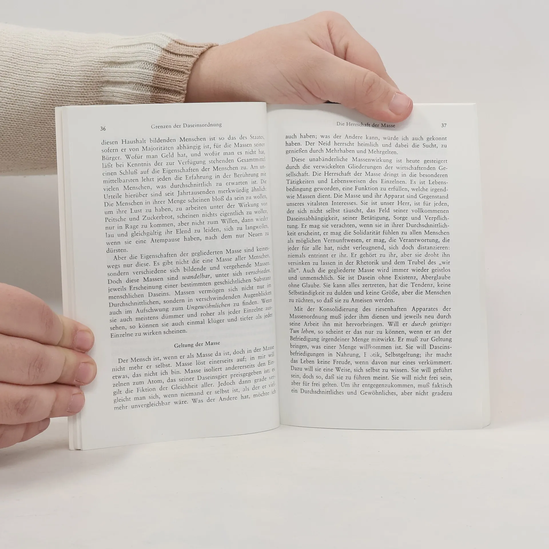 Jaspers sieht die moderne Gesellschaft in einem Widerstreit. Sie errichtet sich als Massenordnung zur technischen Daseinsfürsorge einer Vielzahl von Menschen und zerstört damit gleichzeitig jene Welt von Schicksal und Autorität, Vertrautheit, Nähe und Entscheidung, in der eigentliche menschliche Existenz allein möglich ist. Nivellierung und Funktionalisierung des Menschen sind der Preis der Moderne. Politisch sorgt sich Jaspers um das Ausbleiben echten Führertums, von dem allein Reformen des zum Erstarren neigenden Apparats der Daseinsfürsorge zu erwarten sind. Die politischen Bewegungen des Faschismus und des Bolschewismus deutet Jaspers nur am Rande als gefährliche Auswege des Menschen aus der allgegenwärtigen Krise in die Leichtigkeit des Gehorchenkönnens. Zwar schenkt er aktuellen politischen Strömungen und Strukturen nur geringe Aufmerksamkeit, aber die geistige Haltung und persönliche Verantwortlichkeit des Einzelnen implizieren den Abscheu gegen den sich ankündigenden politischen Wahnsinn in Deutschland. Der Staat gilt ihm als Phänomen der Macht. Nachdenklich blickt Jaspers auch auf die Wissenschaften vom Menschen. Für ihre unbestreitbaren Erfolge zahlt der Mensch mit der Verdinglichung seiner selbst. Er wird sich zum Objekt.