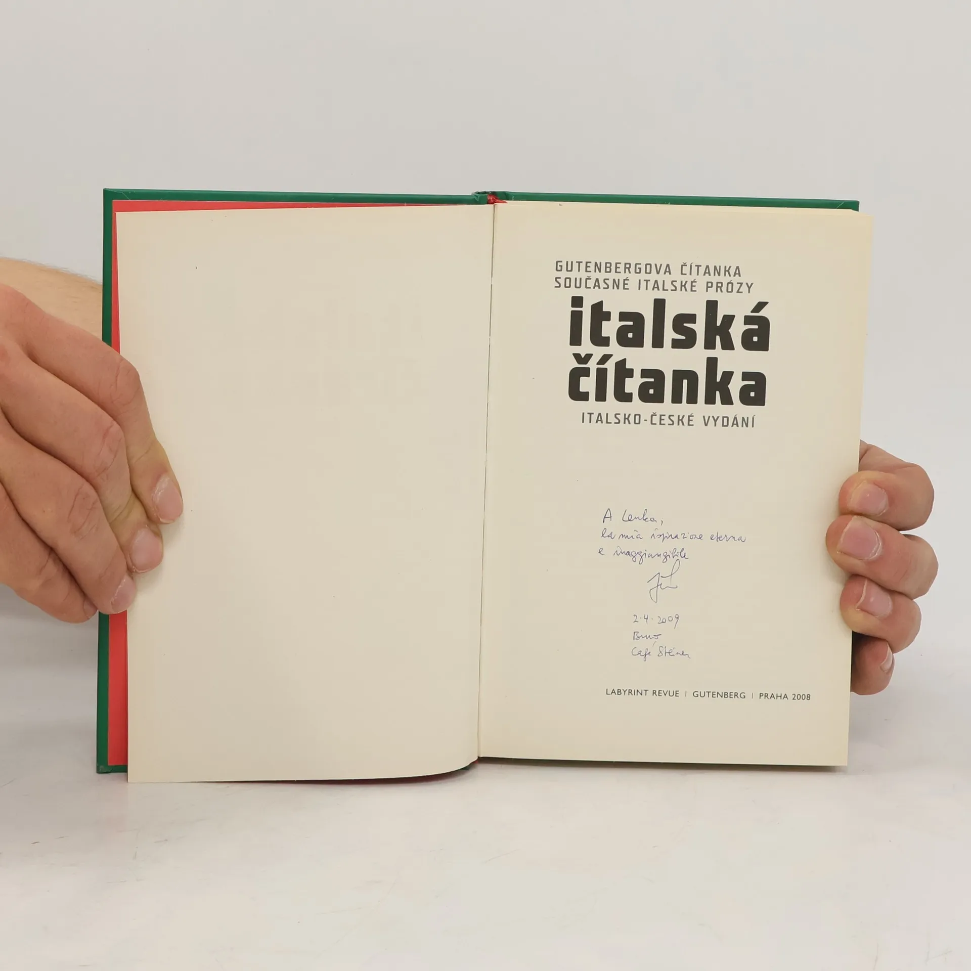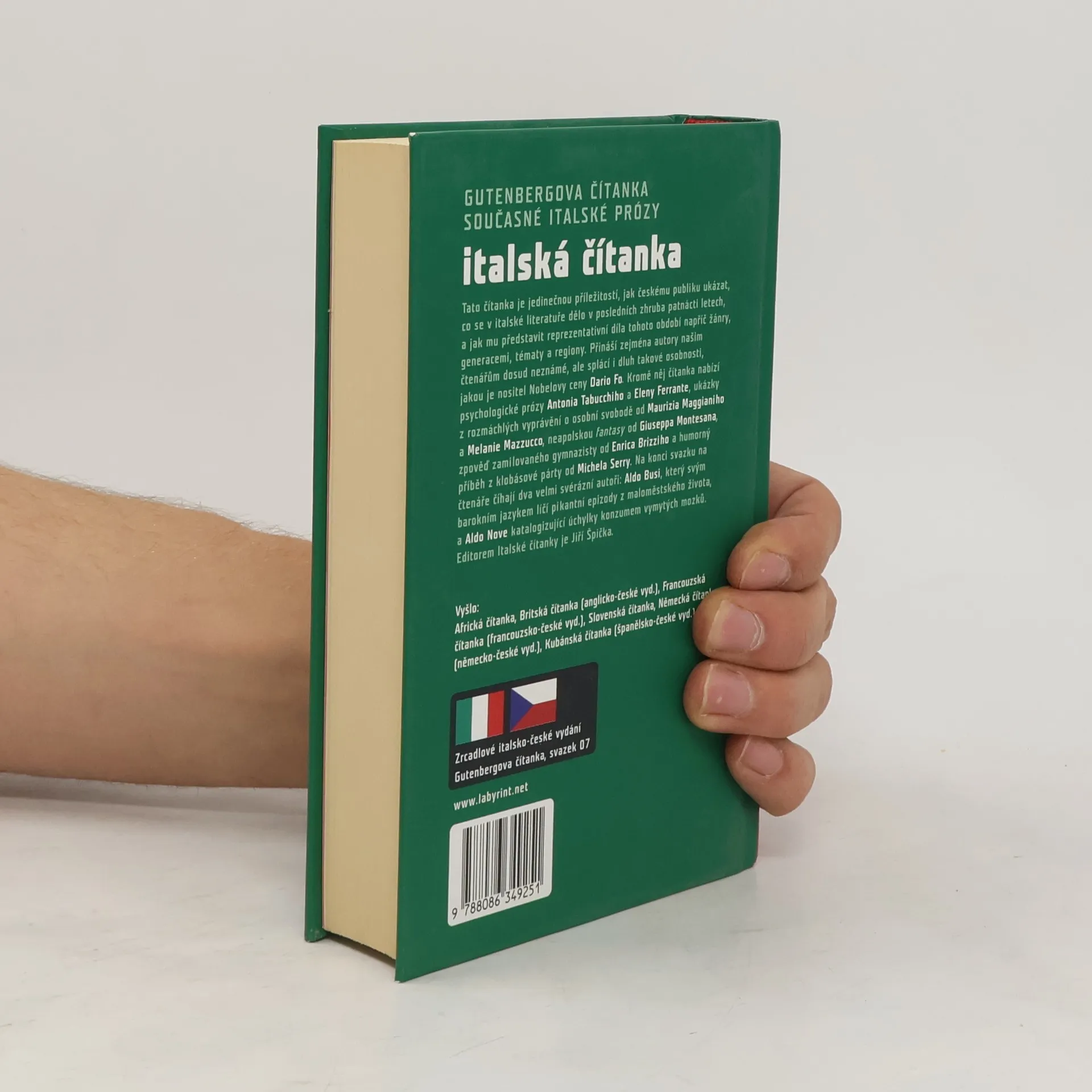 Gutenbergova čítanka současné italské prózy. Tato čítanka je jedinečnou příležitostí, jak českému publiku ukázat, co se v italské literatuře dělo v posledních zhruba patnácti letech, a jak mu představit reprezentativní díla tohoto období napříč žánry, generacemi, tématy a regiony. Přináší zejména autory našim čtenářům dosud neznámé, ale splácí i dluh takové osobnosti, jakou je nositel Nobelovy ceny Dario Fo. Kromě něj čítanka nabízí psychologické prózy Antonia Tabucchiho a Eleny Ferrante, ukázky z rozmáchlých vyprávění o osobní svobodě od Maurizia Maggianiho a Melanie Mazzucco, neapolskou fantasy od Giuseppa Montesana, zpověď zamilovaného gymnazisty od Enrica Brizziho a humorný příběh z klobásové párty od Michela Serry. Na konci svazku na čtenáře číhají dva velmi svérázní autoři: Aldo Busi, který svým barokním jazykem líčí pikantní epizody z maloměstského života, a Aldo Nove katalogizující úchylky konzumem vymytých mozků. Zrcadlové italsko-české vydání. 1. vyd.