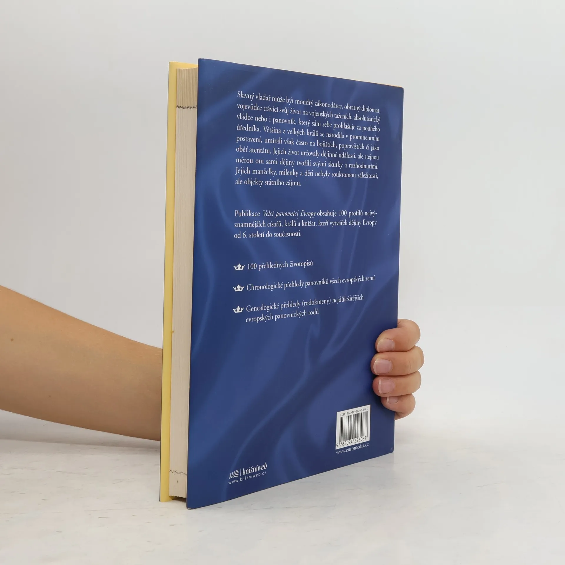 100 nejvýznamnějších císařů, králů a knížat evropských dějin Kniha Velcí panovníci Evropy pojednává o stovce významných vládců, kteří v průběhu patnácti století mezi pádem Říma a naší současností nejvýrazněji utvářeli evropské dějiny – ať již stáli u zrodu nových státních útvarů, vítězili v dobyvačných válkách nebo jen vhodně provdali a oženili své potomky. Pomocí profilů jednotlivých klíčových panovníků publikace mapuje evropské dějiny od Ruska, Bulharska či Osmanské říše až po Švédsko a Velkou Británii. Řazení je chronologické, díky čemuž vynikají vzájemné souvislosti mezi děním v různých zemích. Populárně naučný, avšak faktograficky přesný text doplňují kompletní chronologické přehledy panovníků ve všech evropských zemích a především genealogické přehledy (rodokmeny) nejdůležitějších evropských panovnických rodů.