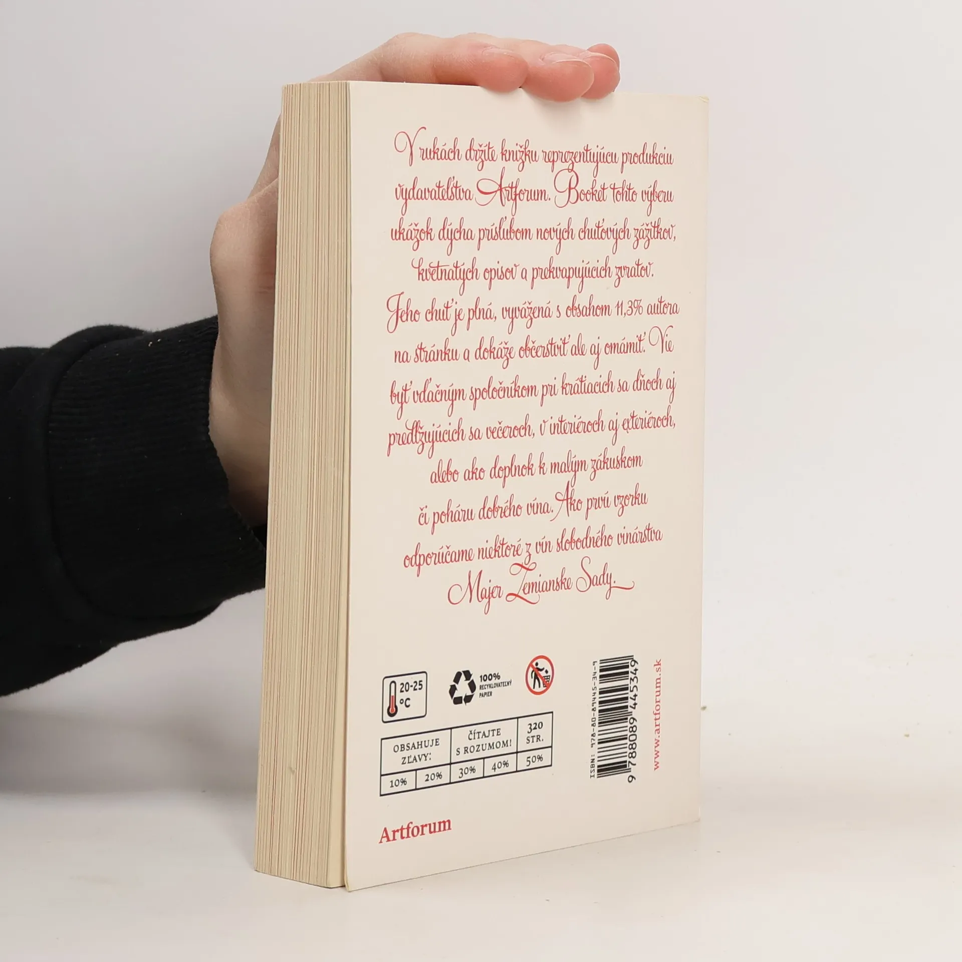 Knižný výber obsahujúci "sadu degustačných vzoriek pre znalcov" - úryvky z textov kníh, ktoré vydavateľstvo Artfórum ponúka svojim čitateľom (Auster, Brautigam, Carter, Giono, Grossman, Jelinek, Jerofejev, Tatarka, Mojžišová, Saroyan, Wallace ...).