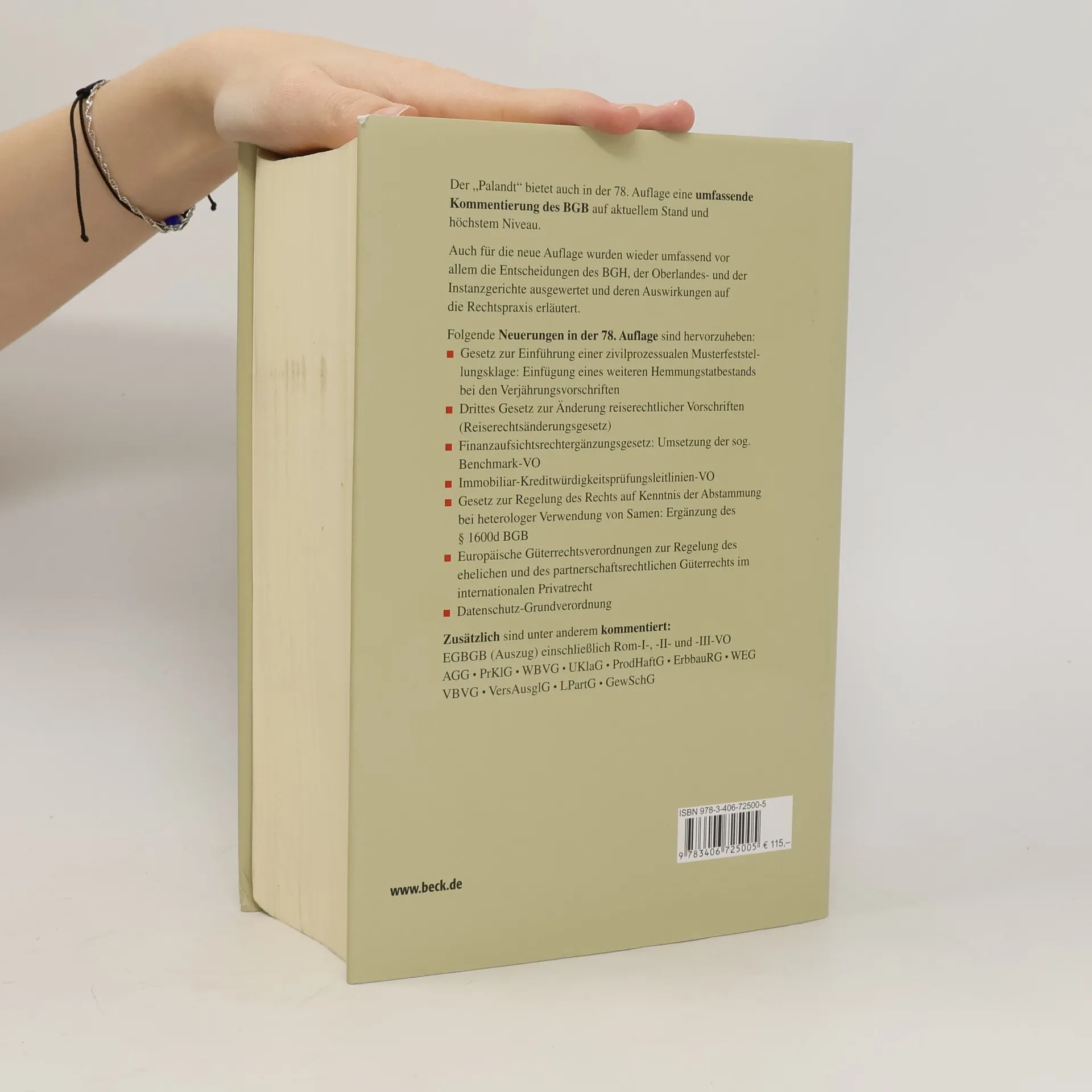 Im zuverlässigen Jahresturnus arbeitet der Palandt aus der oft unüberschaubaren Stofffülle die wesentlichen Informationen heraus und bietet klare, rechtsprechungsorientierte Antworten. Das Palandt-Archiv ermöglicht die Kommentierung von Vorschriften, die nicht mehr in Kraft sind, aber für Altfälle von Bedeutung sein können. Zudem sind umfangreiche gesetzliche Vorschriften, insbesondere europarechtliche Texte, aufgenommen. Die 78. Auflage bietet das gesamte BGB in einem Band, hohe Aktualität (Stand 15.10.2018) und prägnante Erläuterungen. Ein renommiertes Autorenteam hat alle Inhalte überprüft und den Kommentar grundlegend aktualisiert. Berücksichtigt sind gesetzliche Neuerungen wie das Gesetz zur Einführung einer zivilprozessualen Musterfeststellungsklage, Änderungen im Reiserecht, das Finanzaufsichtsrechtergänzungsgesetz und Regelungen zur Abstammung bei heterologer Verwendung von Samen. Zahlreiche wichtige Entscheidungen des BVerfG, BGH, BAG und EuGH sind neu kommentiert. Beispiele umfassen die BGH-Entscheidungen zur Abwicklung von Kfz-Schäden, Schadensersatz bei Kaufpreisminderung und zur Wirksamkeitskontrolle von Eheverträgen. Weitere Themen sind der digitale Nachlass, Eigentumserwerb durch Erbengemeinschaften sowie Entscheidungen des EuGH zur Konfessionszugehörigkeit und zur Fluggastrechteverordnung.