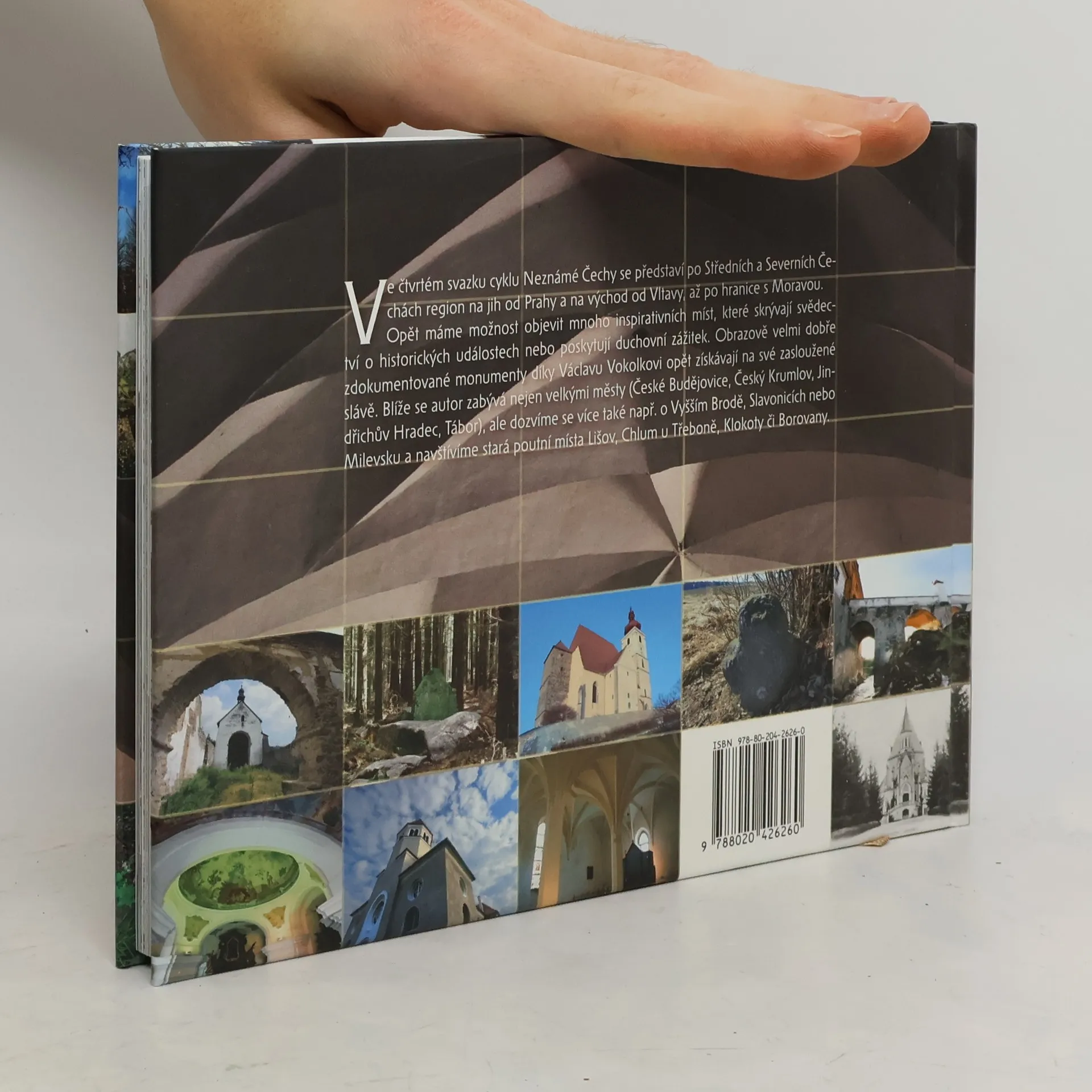 Ve čtvrtém svazku cyklu Neznámé Čechy se představí po Středních a Severních Čechách region na jih od Prahy a na východ od Vltavy, až po hranice s Moravou. Opět máme možnost objevit mnoho inspirativních míst, které skrývají svědectví o historických událostech nebo poskytují duchovní zážitek. Obrazově velmi dobře zdokumentované monumenty díky autorovi opět získávají na své zasloužené slávě. Blíže se autor zabývá nejen velkými městy (České Budějovice, Český Krumlov, Jindřichův Hradec, Tábor), ale dozvíme se více také např. o Vyšším Brodě, Slavonicích nebo Milevsku a navštívíme stará poutní místa Lišov, Chlum u Třeboně, Klokoty či Borovany.
