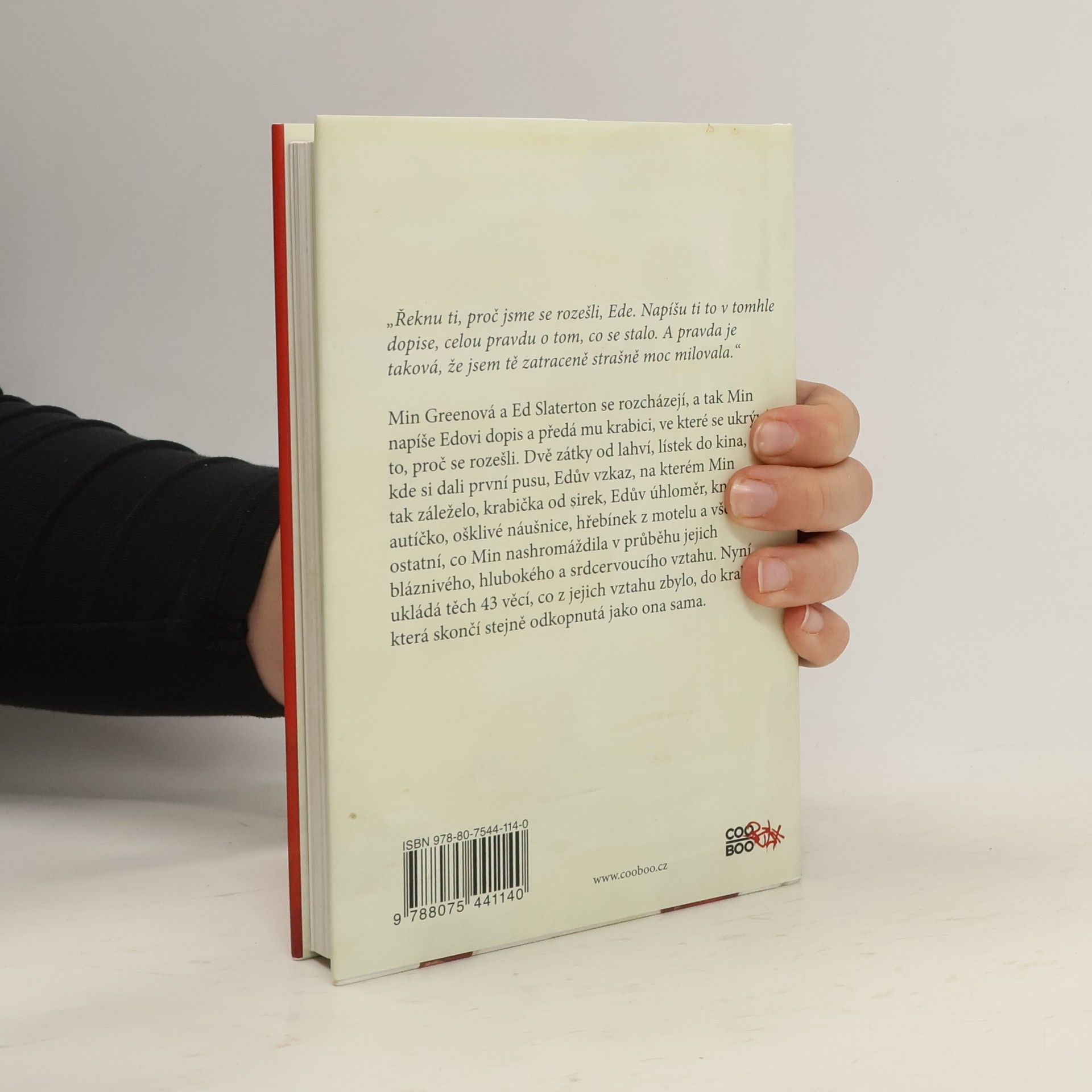 Min Greenová a Ed Slaterton se rozcházejí, a tak Min napíše Edovi dopis a předá mu krabici, ve které se ukrývá to, proč se rozešli. Dvě zátky od lahví, lístek do kina, kde si dali první pusu, Edův vzkaz, na kterém Min tak záleželo, krabička od sirek, Edův úhloměr, knihy, autíčko, ošklivé náušnice, hřebínek z motelu a všechno ostatní, co Min nashromáždila v průběhu jejich bláznivého, hlubokého a srdcervoucího vztahu. Nyní ukládá těch 43 věcí, co z jejich vztahu zbylo, do krabice, která skončí stejně odkopnutá jako ona sama.