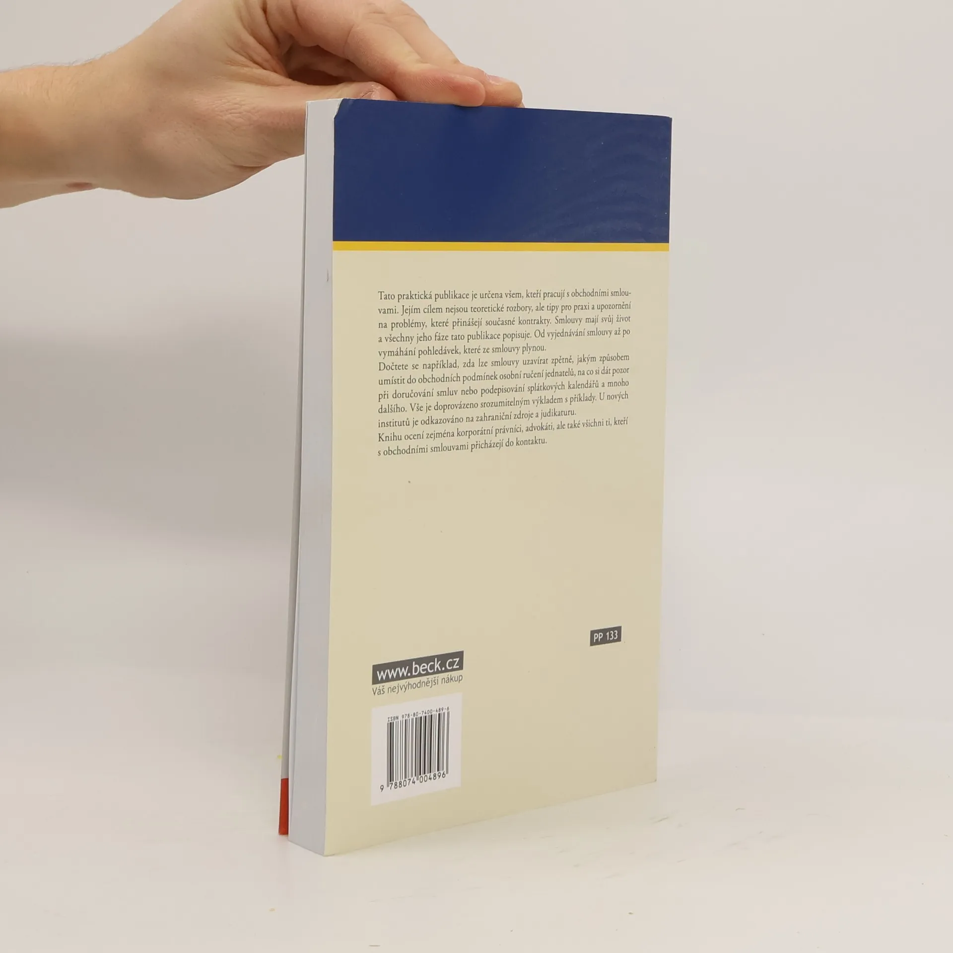 Publikace určená všem, kteří pracují s obchodními smlouvami. Popisuje všechny důležité fáze v životě obchodních smluv, od jejich vyjednávání až po uplatňováním práv z těchto smluv. V knize najdeme mj. informace o způsobu umístění osobního ručení jednatelů do obchodních podmínek, doručování smluv, podepisování splátkových kalendářů nebo o vymáhání pohledávek, které ze smlouvy plynou, a mnoho dalšího. Vše je doprovázeno srozumitelným výkladem s příklady. U nových institutů je odkazováno na zahraniční zdroje a judikaturu. Knihu ocení nejen právníci a advokáti, ale také všichni ti, kteří s obchodními smlouvami přicházejí do kontaktu.