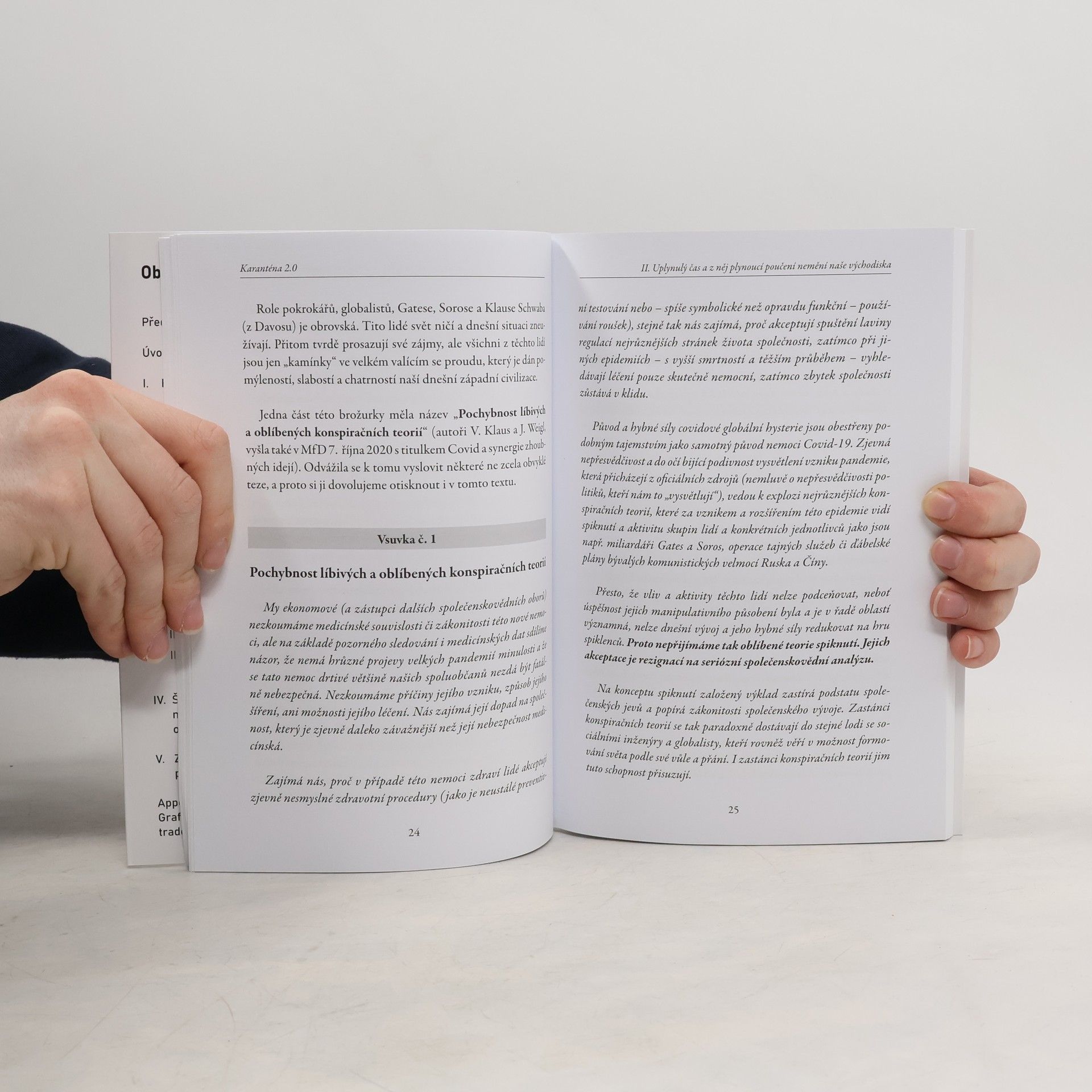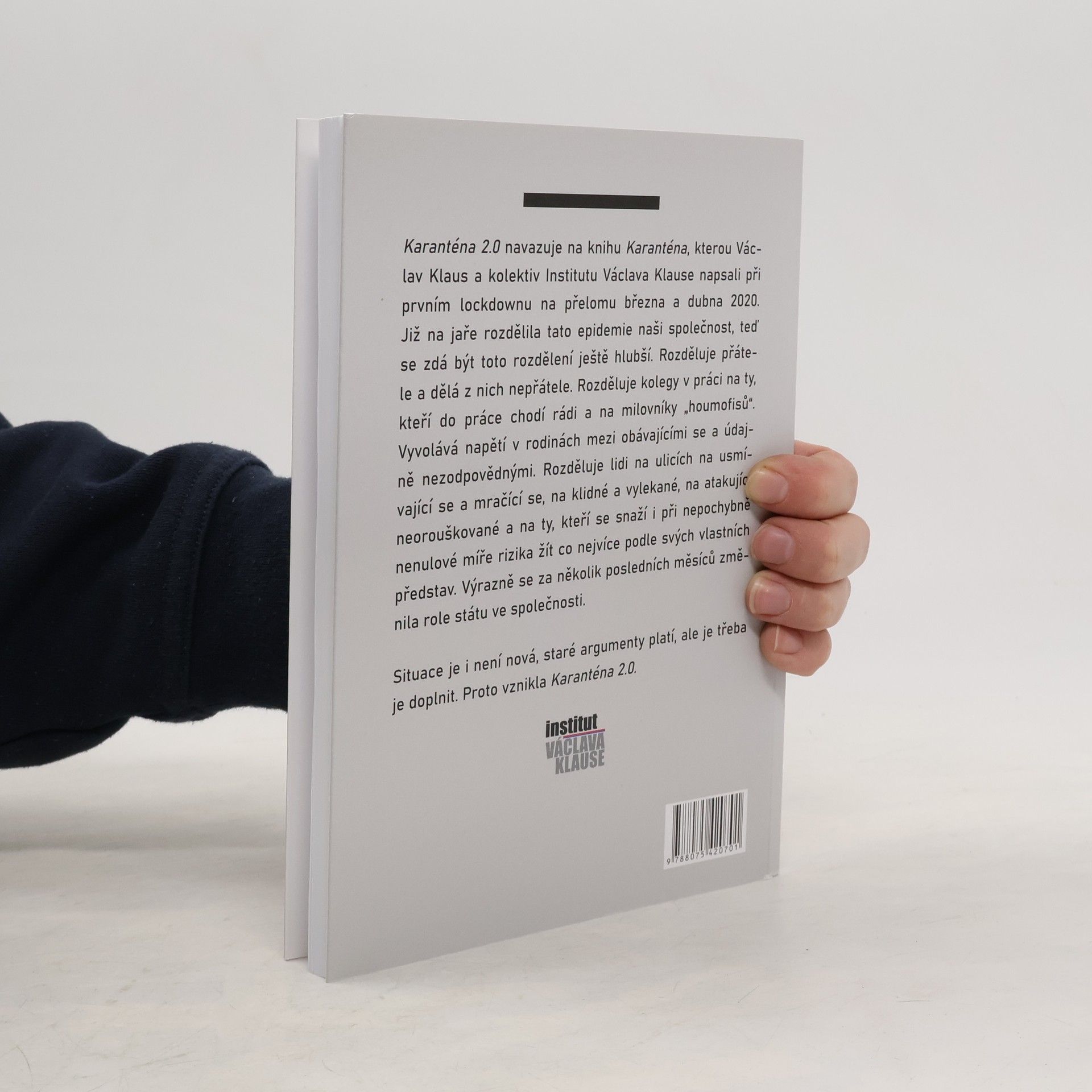 Karanténa 2.0 navazuje na předchozí dílo, které Václav Klaus a kolektiv Institutu Václava Klause napsali během prvního lockdownu na jaře 2020. V úvodu Klaus vyjadřuje touhu poskytnout uklidňující slova a přispět k racionální vládní politice. Epidemie rozděluje společnost, což se na podzim prohlubuje. Přátelé se stávají nepřáteli, kolegové se dělí na ty, kteří preferují práci v kanceláři, a na milovníky práce z domova. Napětí narůstá i v rodinách mezi těmi, kdo se obávají, a těmi, kdo jsou považováni za nezodpovědné. Na ulicích se lidé dělí na usmívající se a mračící se, na klidné a vylekané, a na ty, kteří se snaží žít podle svých představ navzdory riziku. Role státu se dramaticky změnila; z okrajové instituce se stal všudypřítomný demiurg ovlivňující každou minutu našich životů. Ačkoliv staré argumenty zůstávají platné, je nutné je doplnit. Autoři již dříve vyjádřili obavy z lidí více než z virů, a nyní je jasné, že strach se více soustředí na dění v lidské společnosti mimo medicínskou sféru. Karanténa 2.0, vzniklá na základě diskusí uvnitř Institutu, je autorským textem, který reflektuje tyto změny.