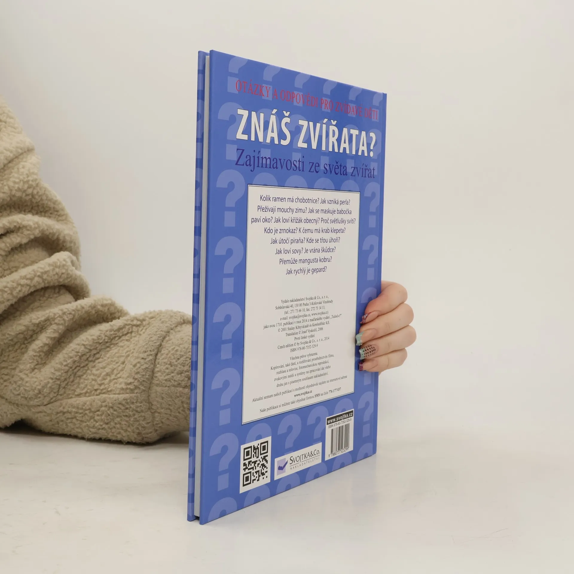Kolik ramen má chobotnice? Jak vzniká perla? Přežívají mouchy zimu?Jak se maskuje babočka paví oko? Jak loví křižák obecný? Proč světlušky svítí? Kdo je zrnokaz? K čemu má krab klepeta? Jak útočí piraňa? Kde se třou úhoři? Jak loví sovy? Je vrána škůdce? Přemůže mangusta kobru? Jak rychlý je gepard? Všechny tyto otázky vám zodpoví tato ilustrovaná publikace se spoustou zajímavostí ze světa zvířat.