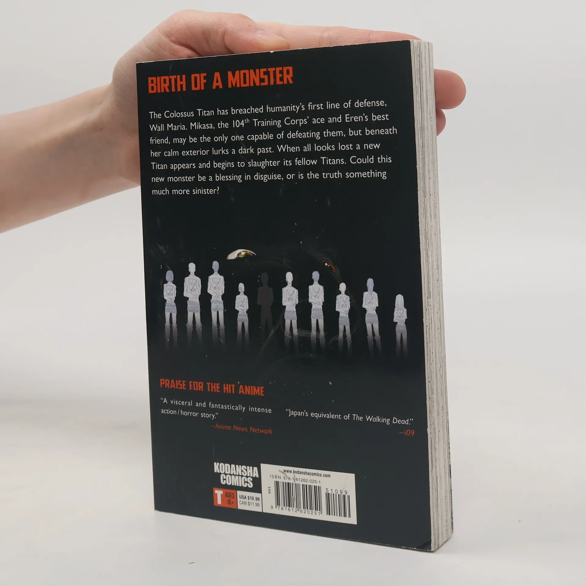 BIRTH OF A MONSTER The Colossal Titan has breached humanity’s first line of defense, Wall Maria. Mikasa, the 104th Training Corps’ ace and Eren’s best friend, may be the only one capable of defeating them, but beneath her calm exterior lurks a dark past. When all looks lost, a new Titan appears and begins to slaughter its fellow Titans. Could this new monster be a blessing in disguise, or is the truth something much more sinister? This volume of Attack on Titan includes special extras after the story! The megahit Attack on Titan anime finally returns, streaming on April 1!