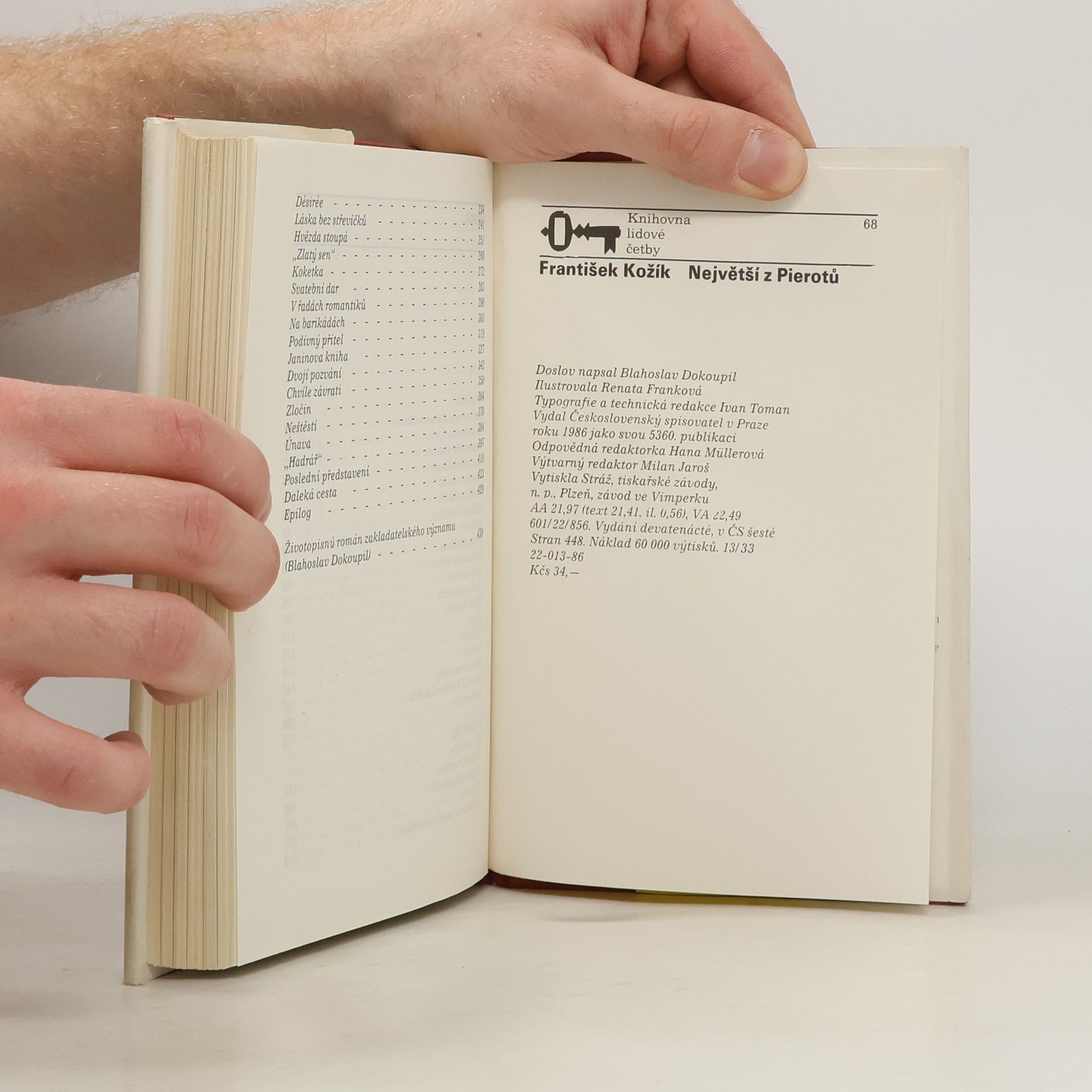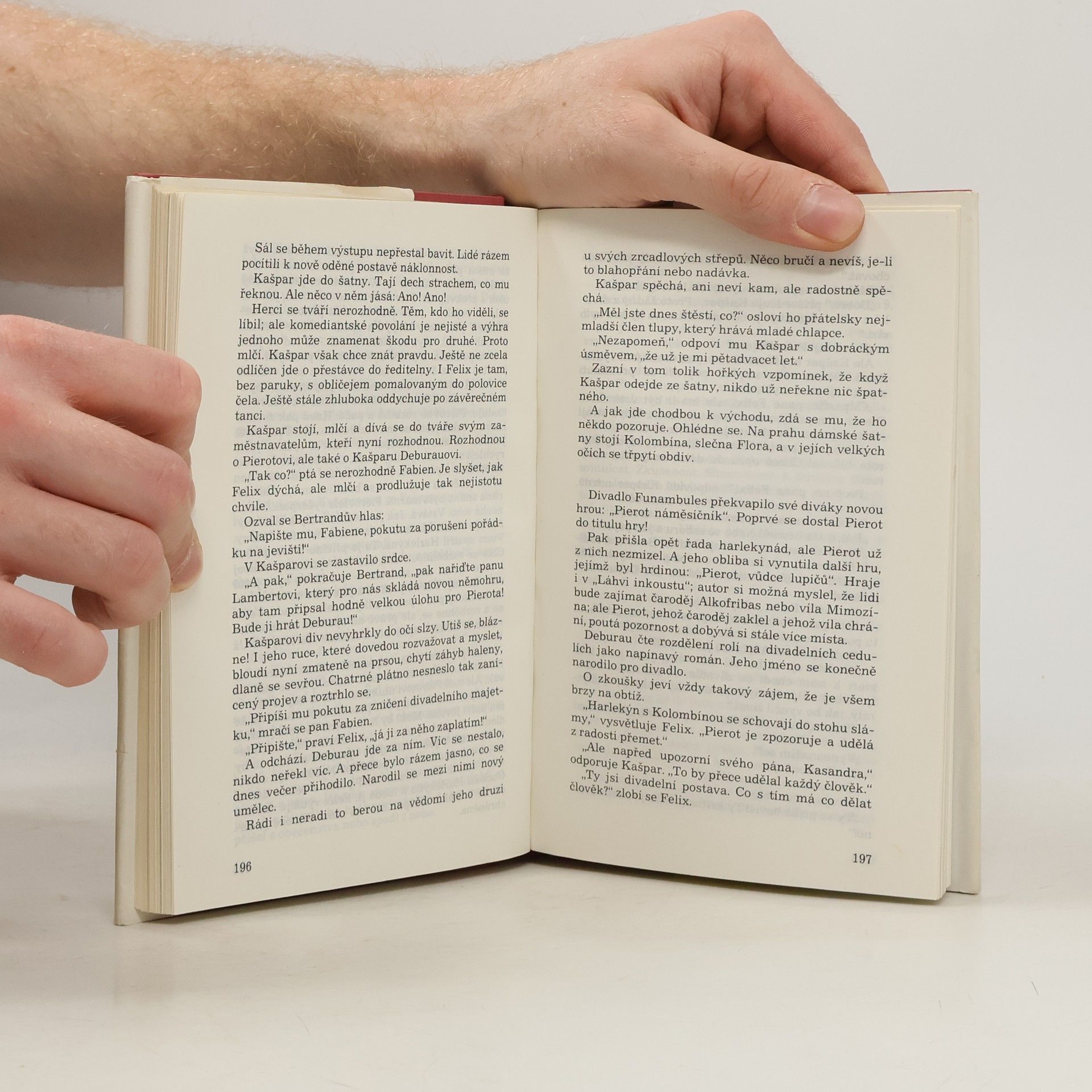Franková Renata ilustrace černobílé celostránkové. Rozsáhlý román inspirovaný životní a uměleckou dráhou mistra pantomimy Jeana Gaspara Deburaua (1796-1846), který byl po své matce českého původu. Autor líčí jeho dětství a mládí strávené uprostřed kočovné artistické společnosti,léta čekání na výraznější umělecký úspěch a konečně i léta triumfu a uznání. V Paříži dosáhl po mnoha letech nesmírné popularity a byl milován a obdivován všemi - od prostého publika až po přestavitele kulturní elity tehdejší Francie. Román není životopisem v pravém slova smyslu, ale především psychologickou studií o cestě umělce za vyjádřením svých představ a poetickou básní o divadle a lidském životě.